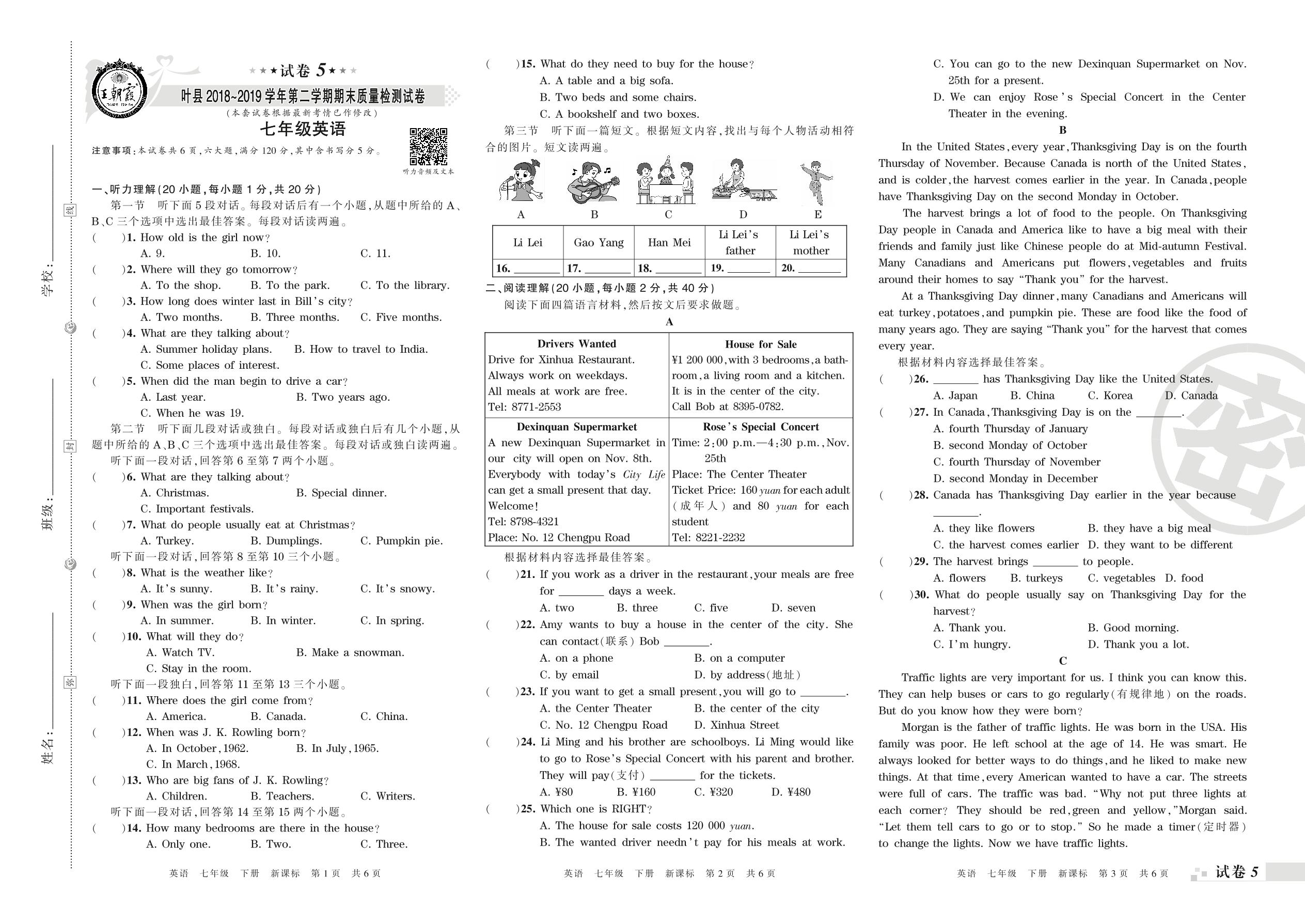 2018-2019学年第二学期平顶山市叶县七年级英语试卷(新课版)【5】