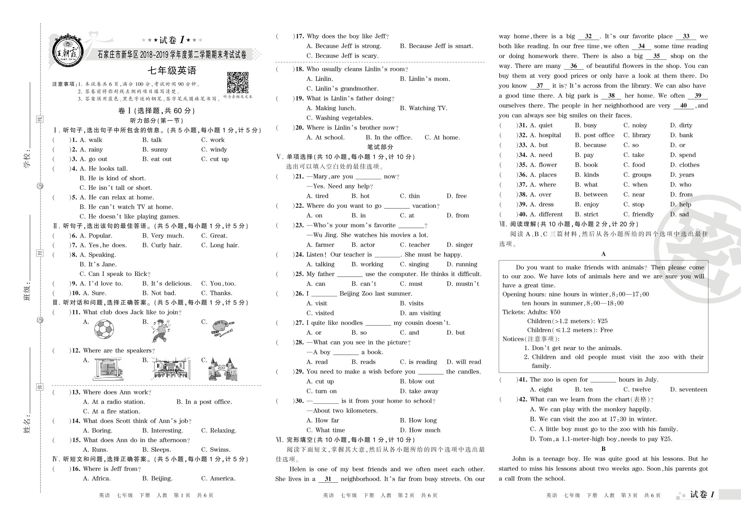 2018-2019学年第二学期石家庄市新华区七年级英语试卷(人教版)【1】