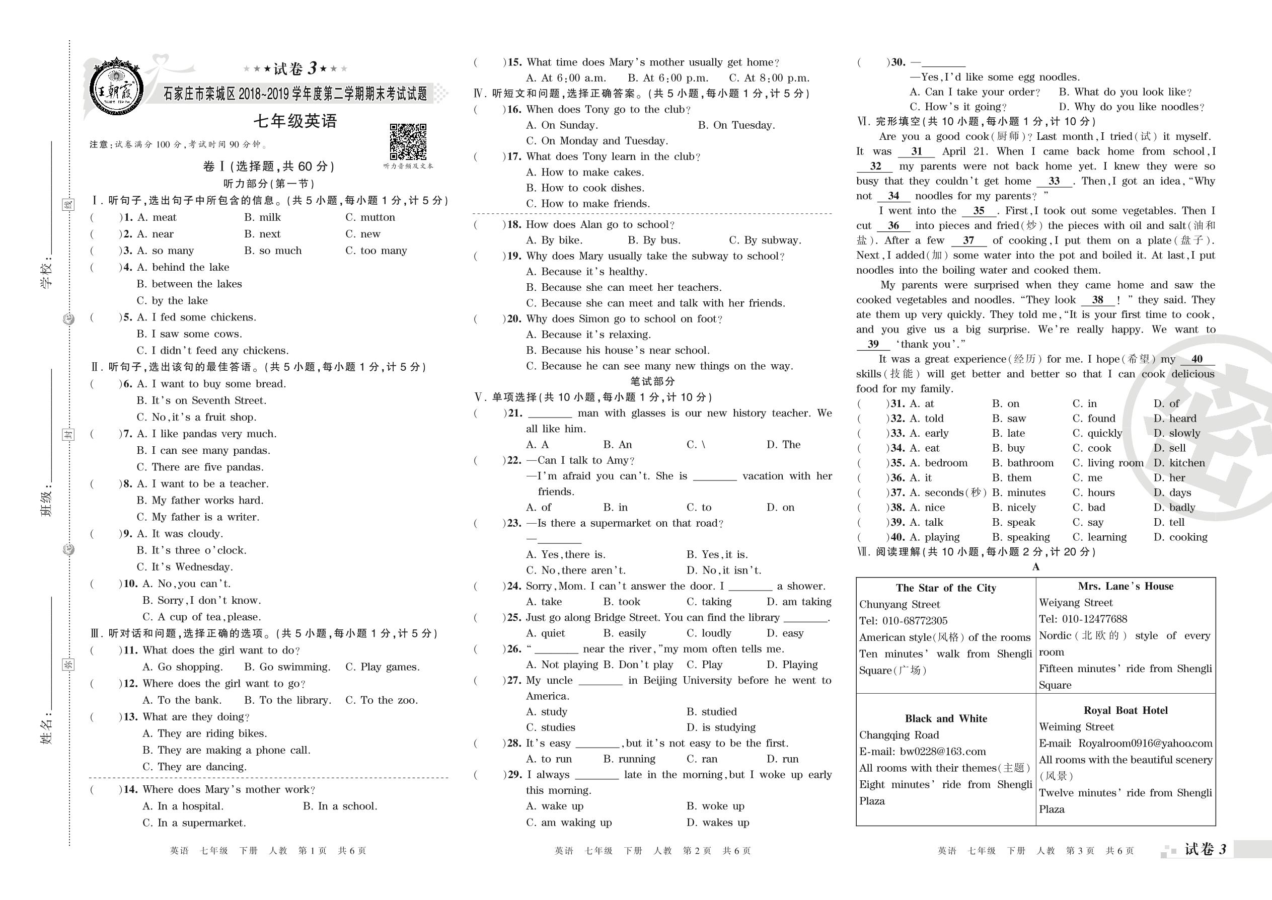 2018-2019学年第二学期石家庄市栾城区七年级英语试卷(人教版)【3】