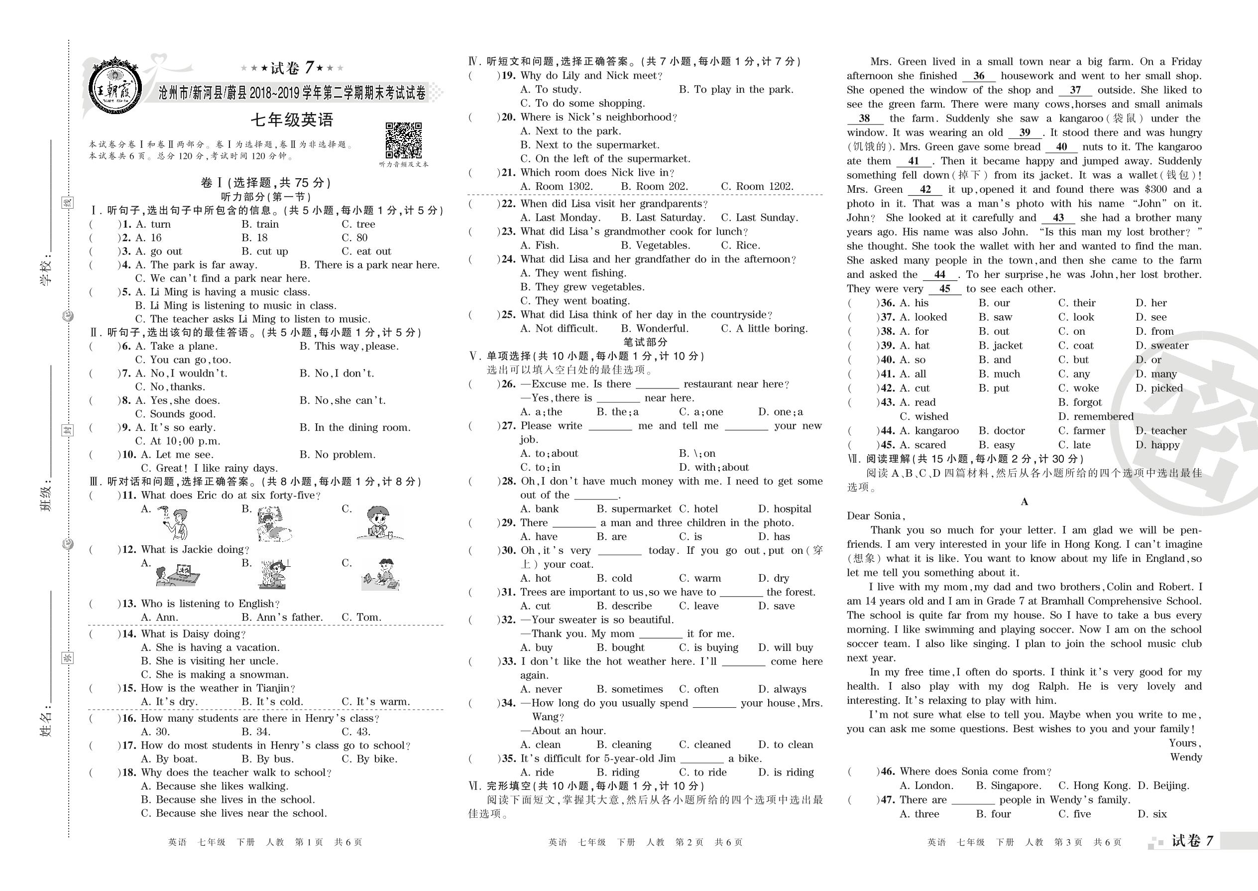 2018-2019学年第二学期沧州市、新河县、蔚县七年级英语试卷(人教版)【7】
