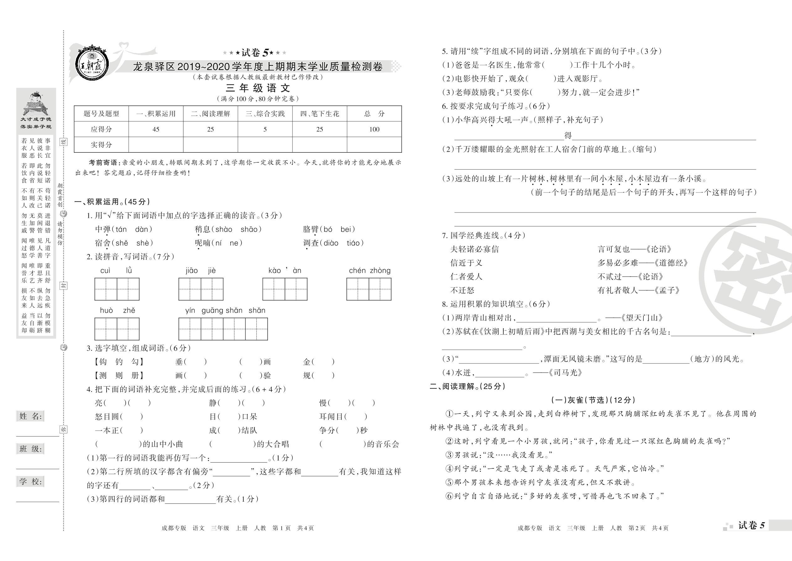 2019-2020学年第一学期成都市龙泉驿区三年级语文试卷(人教版)【5】