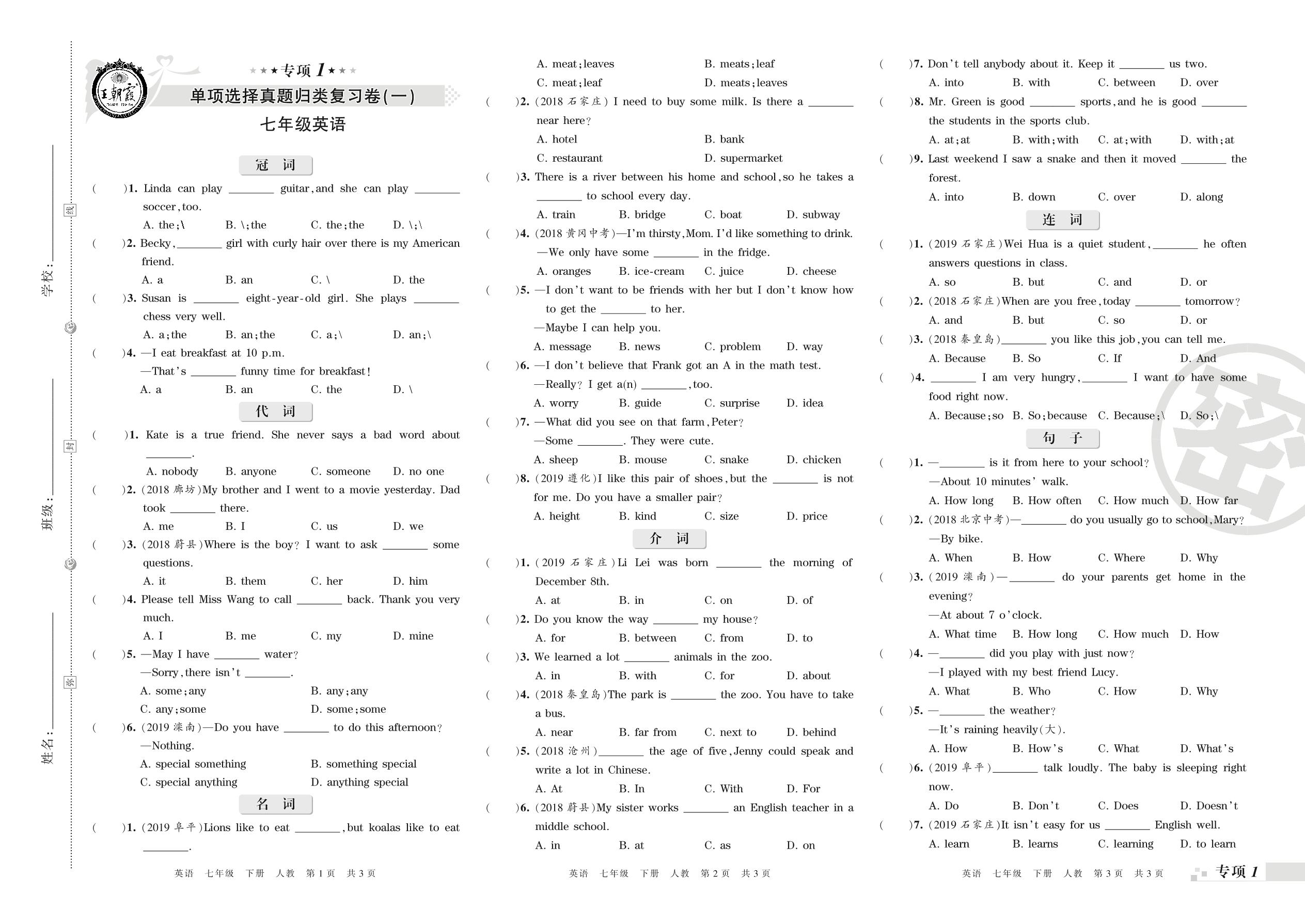 王朝霞期末专项卷——单项选择(一)(二)真题归类复习卷七年级下册英语(人教版)_R210807193515【0】