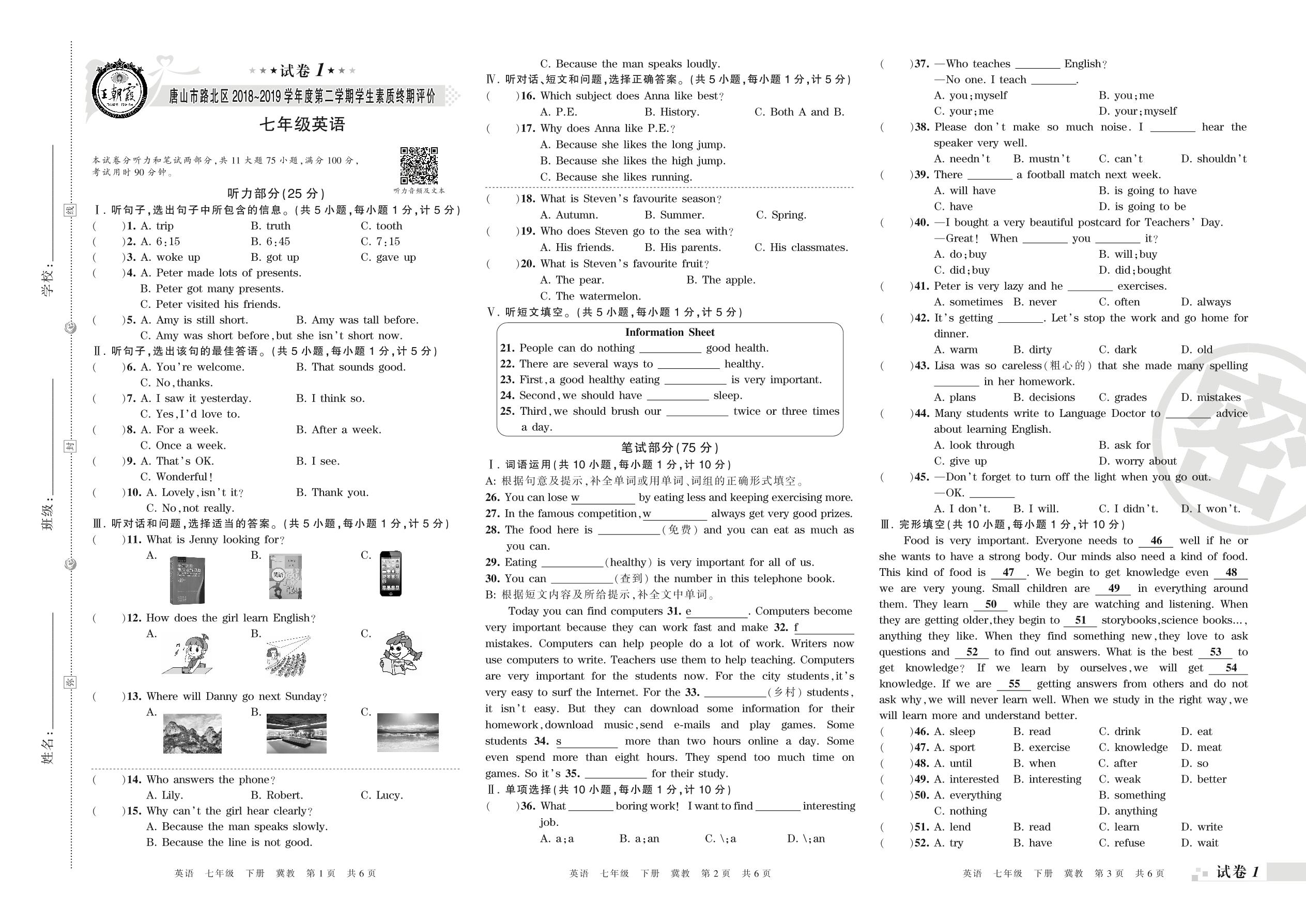 2018-2019学年第二学期唐山市路北区七年级英语试卷(冀教版)【1】