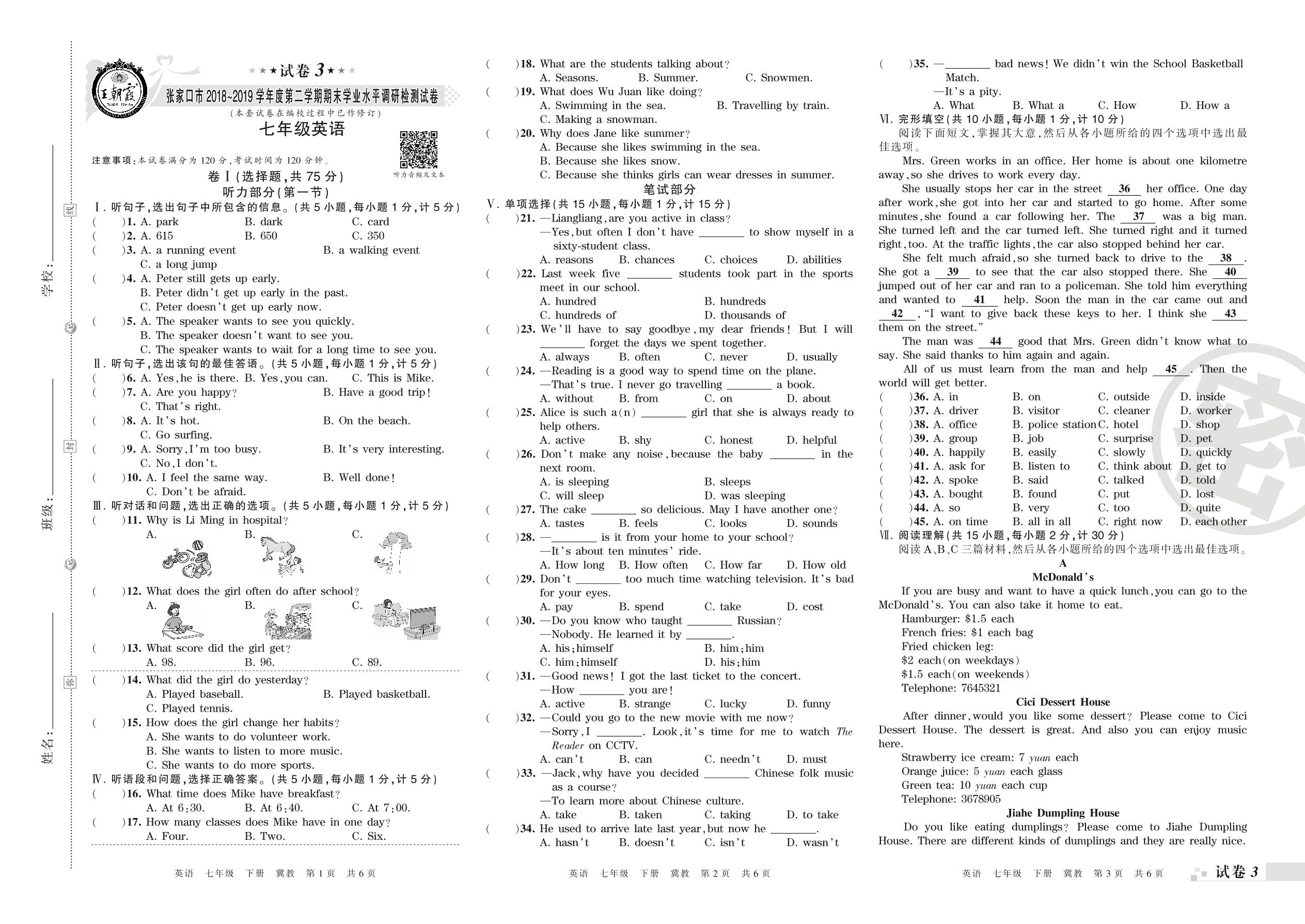 2018-2019学年第二学期张家口市七年级英语试卷(冀教版)【3】