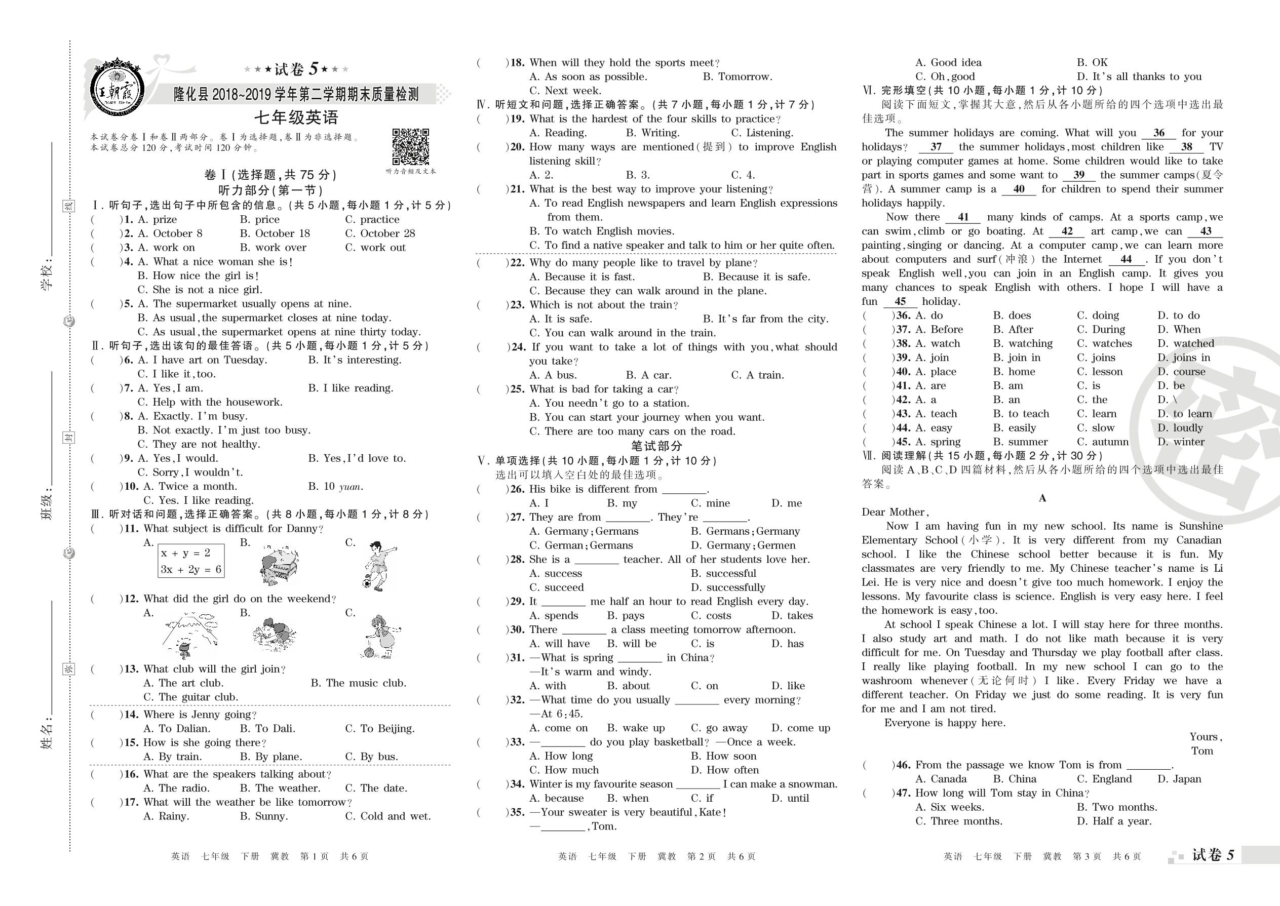 七年级英语冀教版下册期末卷