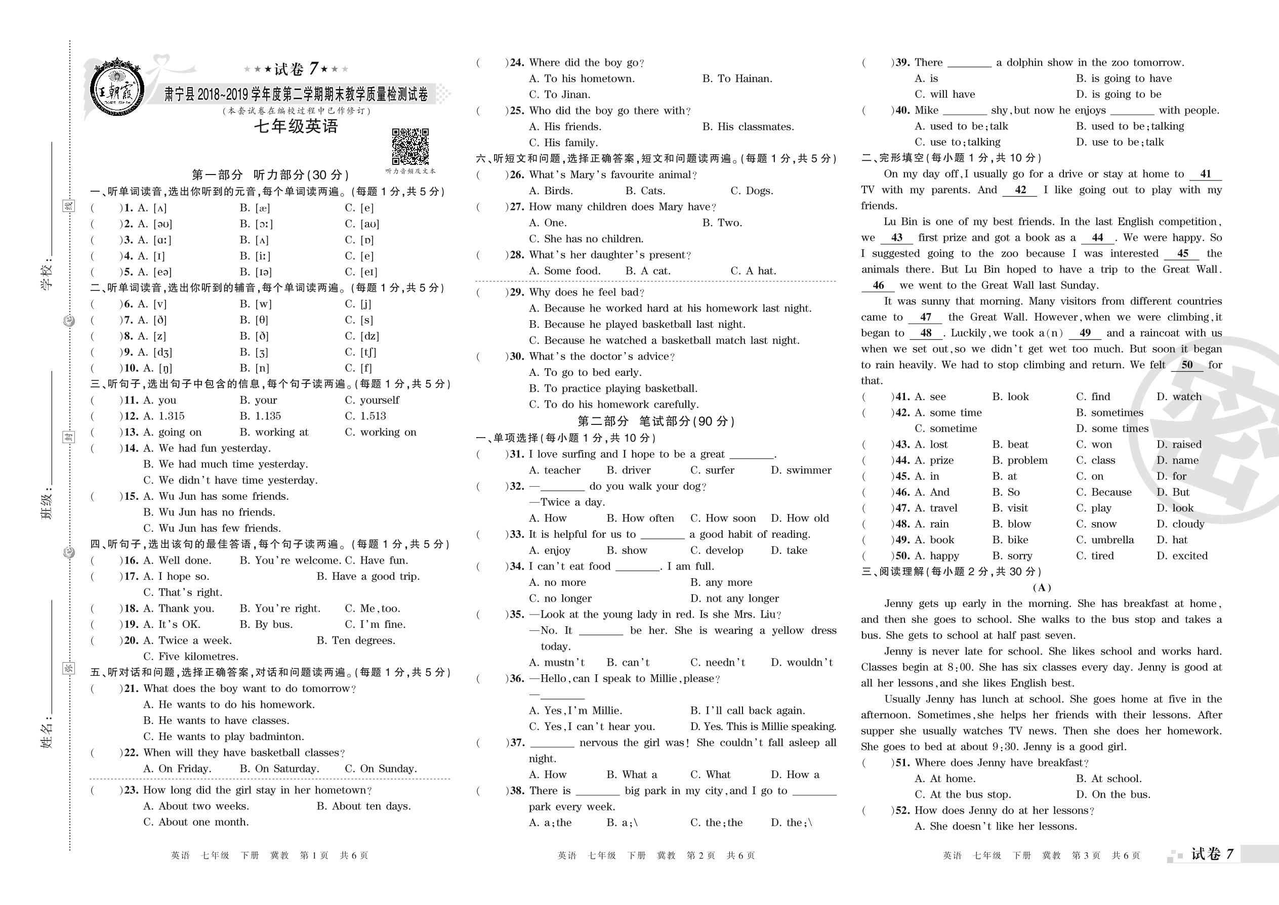 2018-2019学年第二学期沧州市肃宁县七年级英语试卷(冀教版)【7】