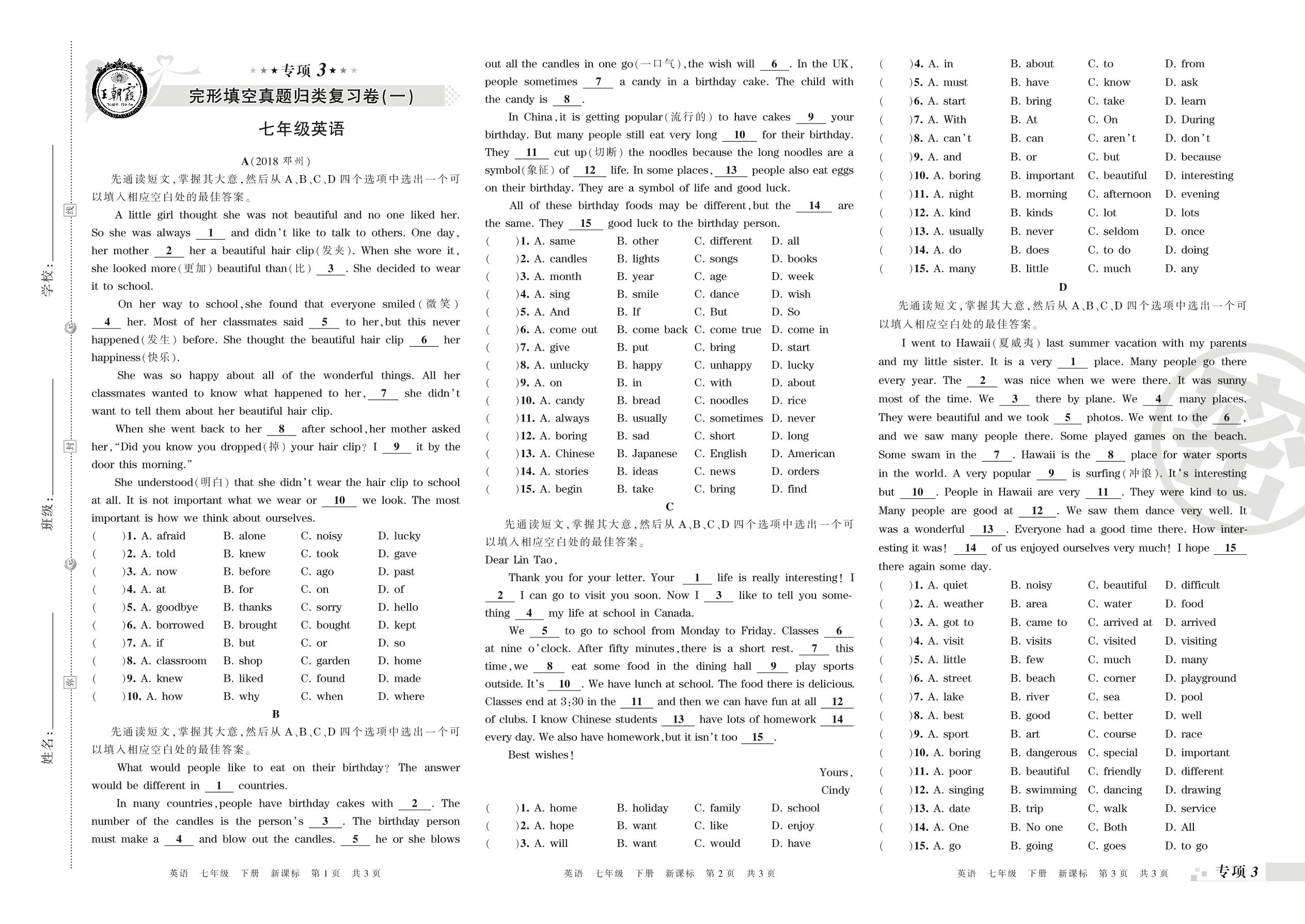 王朝霞期末专项卷——完形填空(一)(二)真题归类复习卷七年级下册英语(新课版)_R210807193737【0】