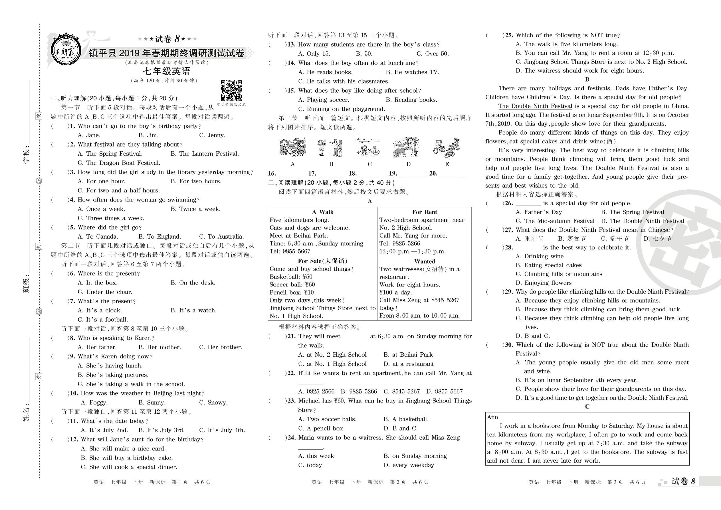 2018-2019学年第二学期南阳市镇平县七年级英语试卷(新课版)【8】