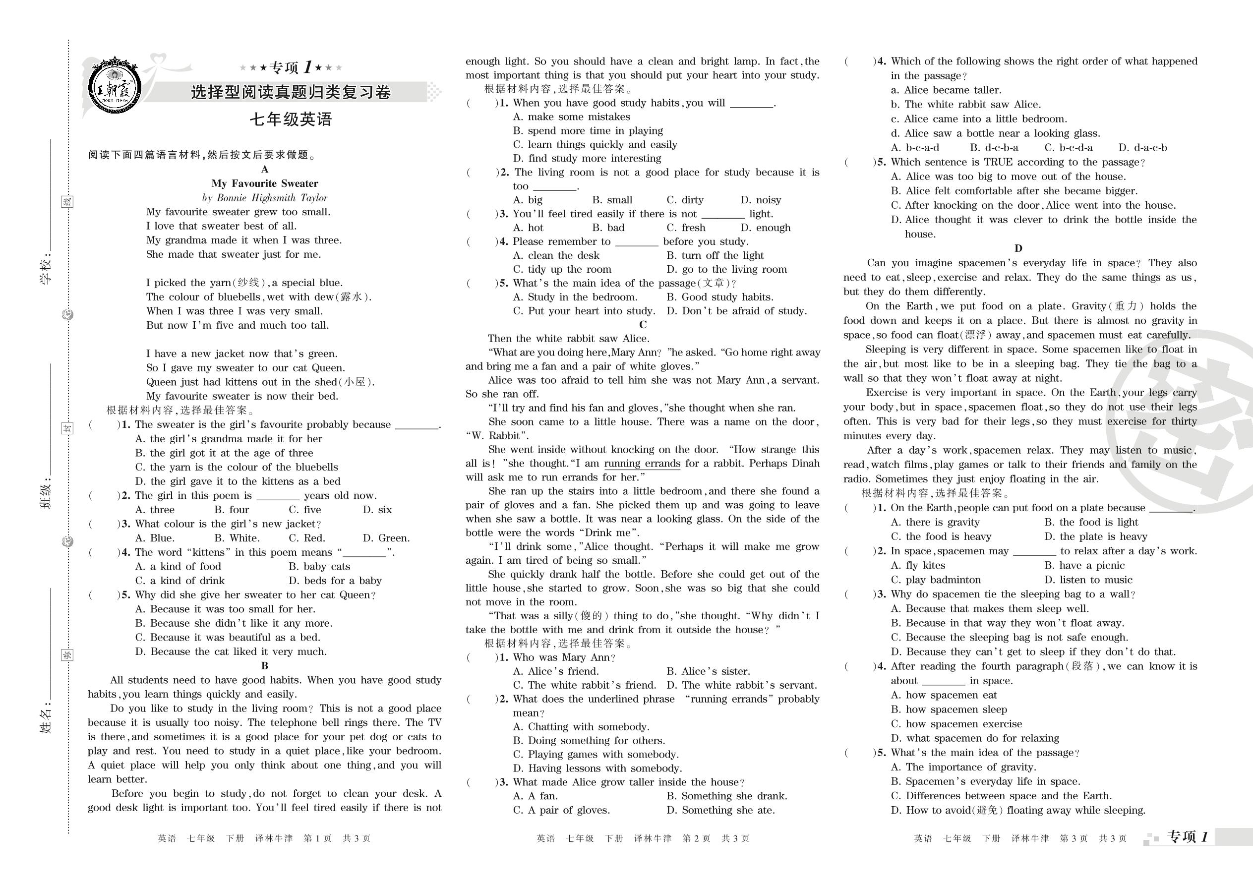 七年级英语译林版(译林牛津版)下册专项卷