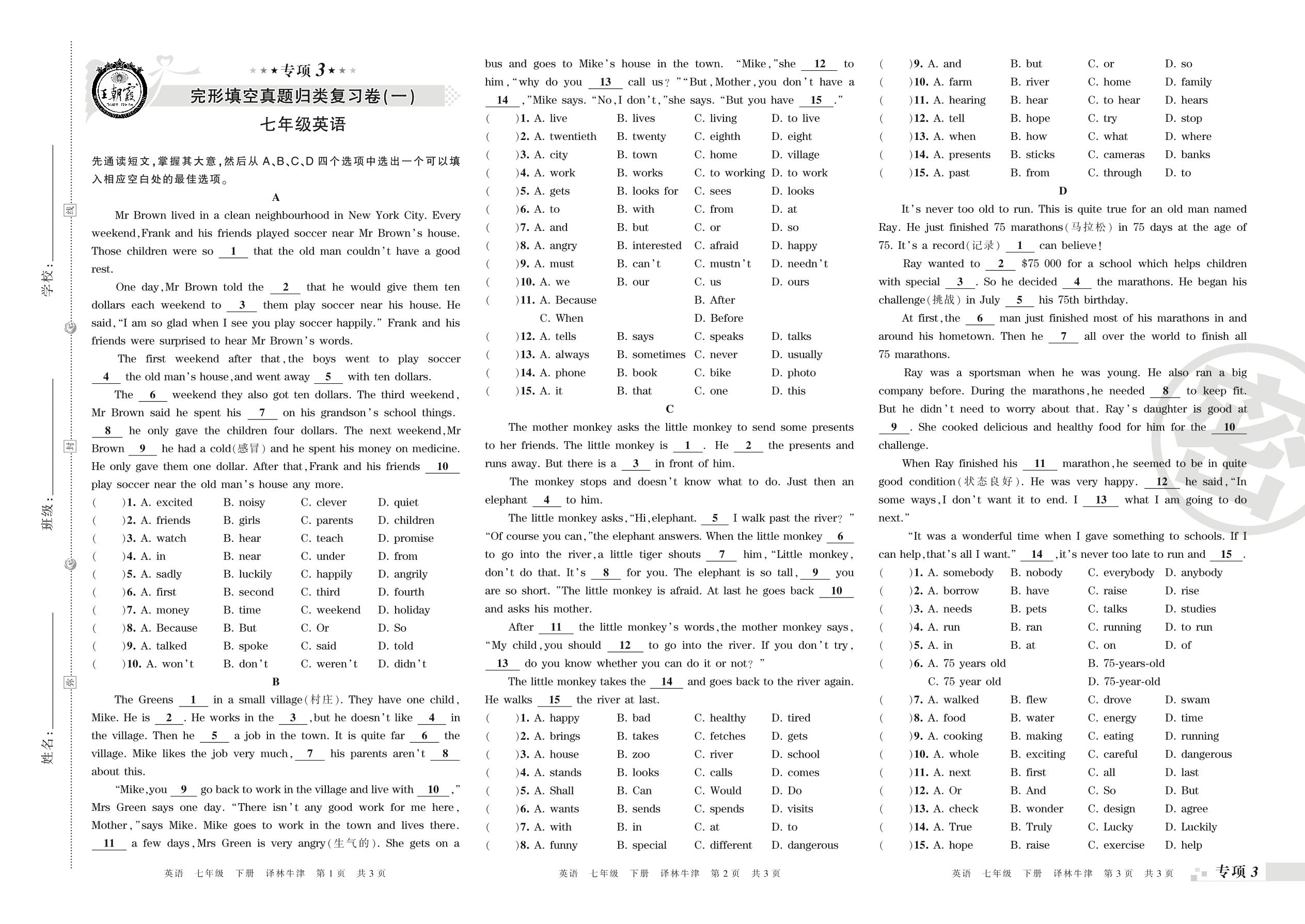 王朝霞期末专项卷——完形填空(一)(二)真题归类复习卷七年级下册英语(译林版)_R210807193927【0】