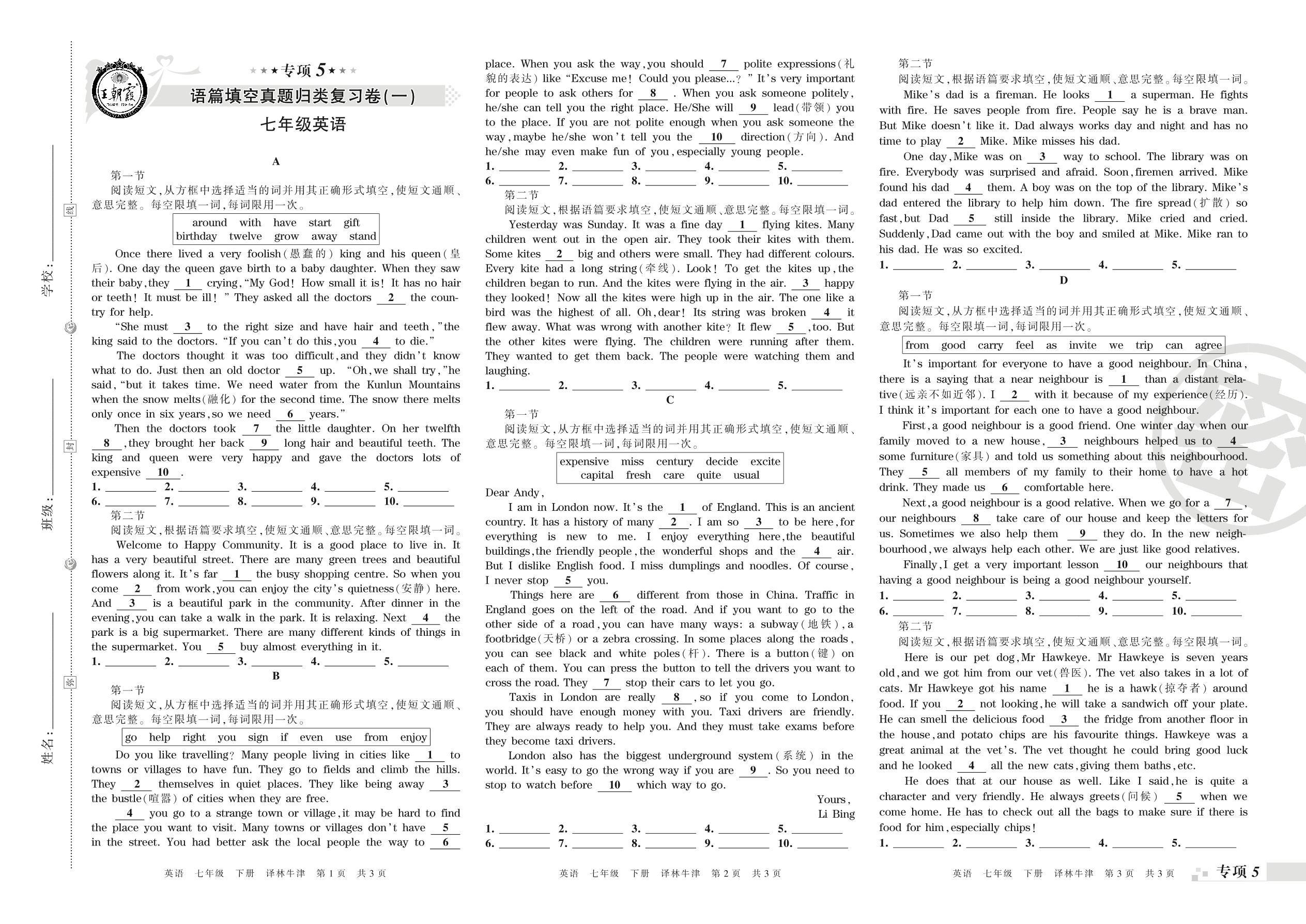 王朝霞期末专项卷——语篇填空(一)(二)真题归类复习卷七年级下册英语(译林版)_R210807193933【0】