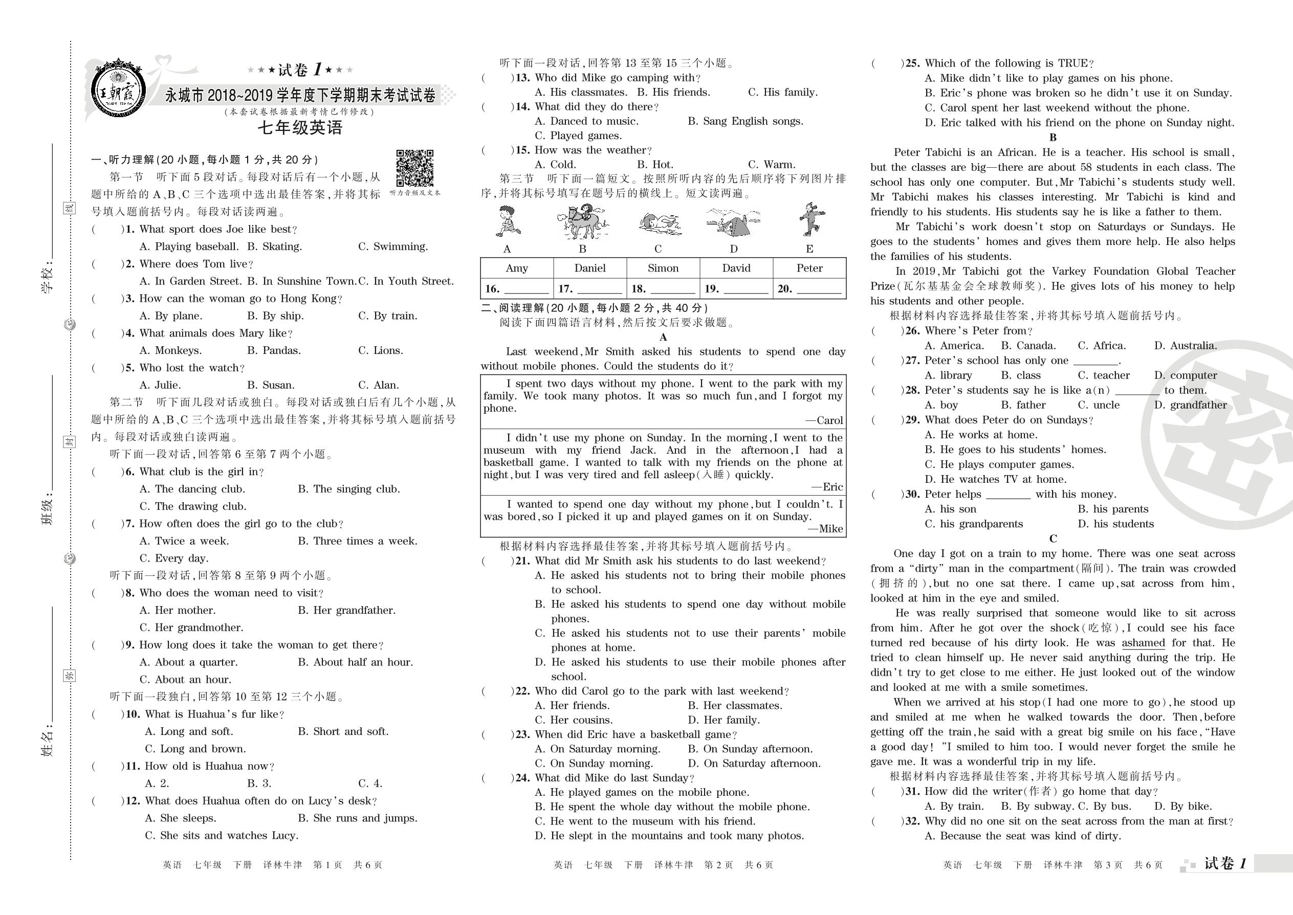 2018-2019学年第二学期永城市七年级英语试卷(译林版)【1】