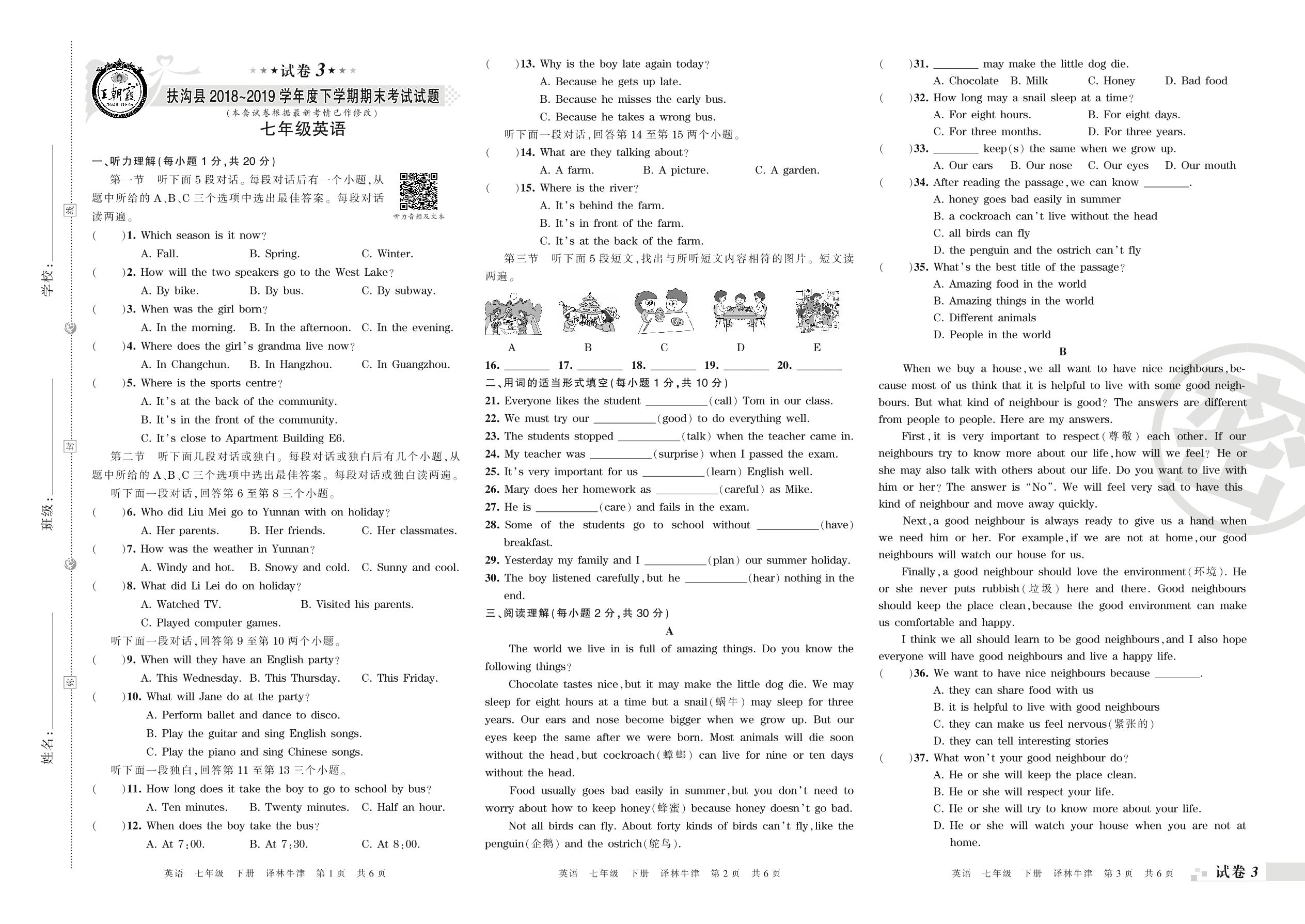 七年级英语译林版(译林牛津版)下册期末卷