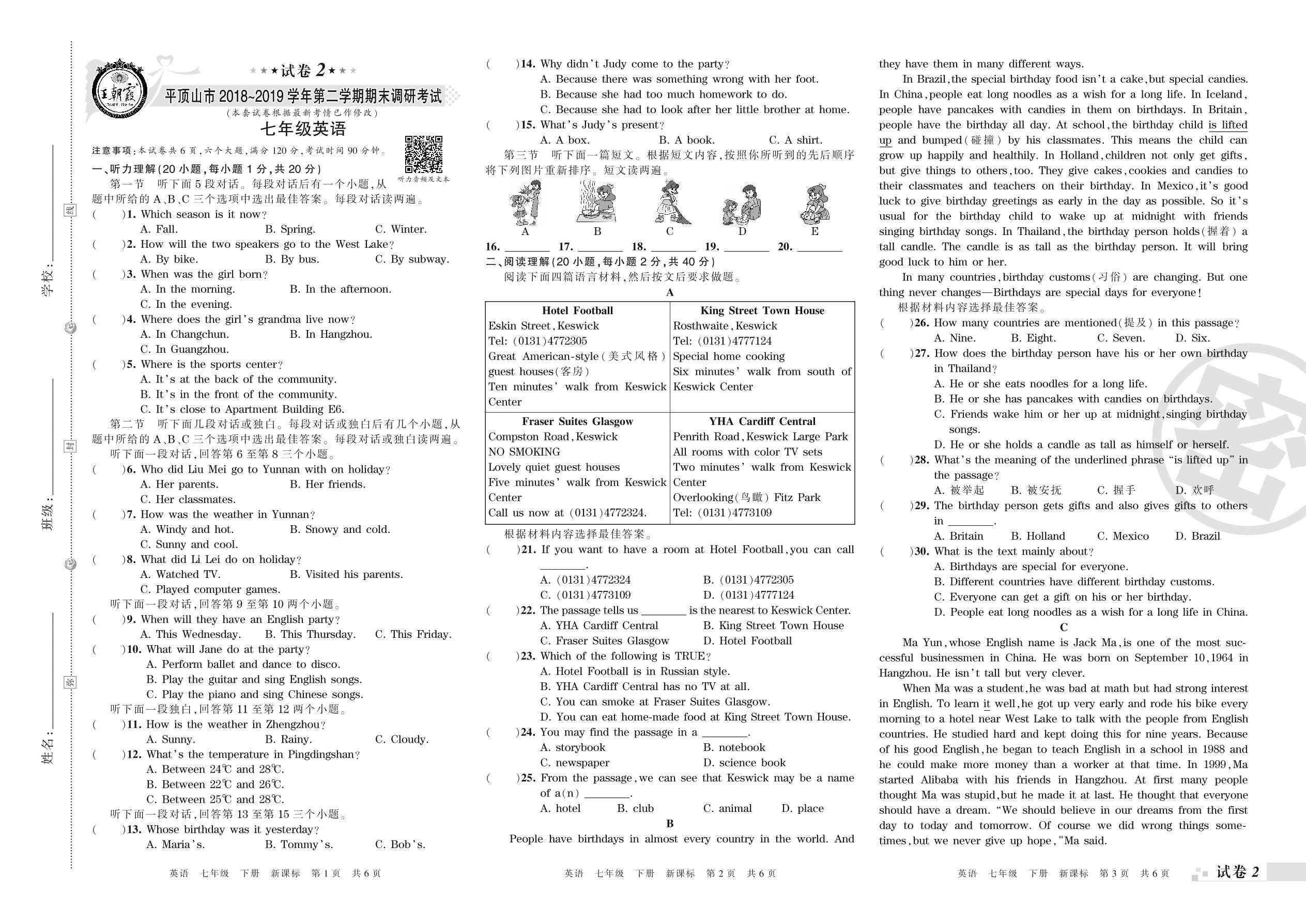2018-2019学年第二学期平顶山市七年级英语试卷(新课版)【2】