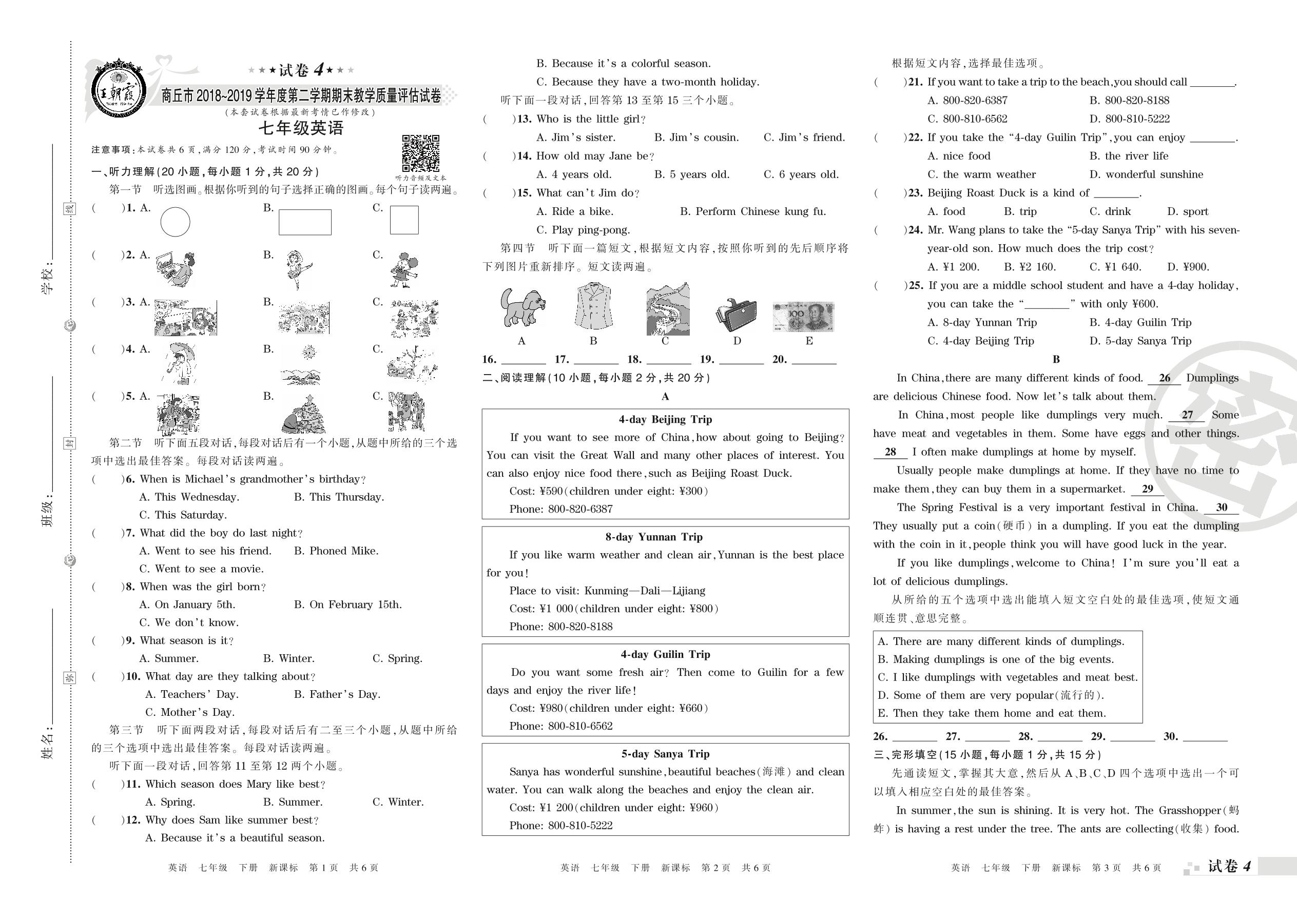 2018-2019学年第二学期商丘市七年级英语试卷(新课版)【4】