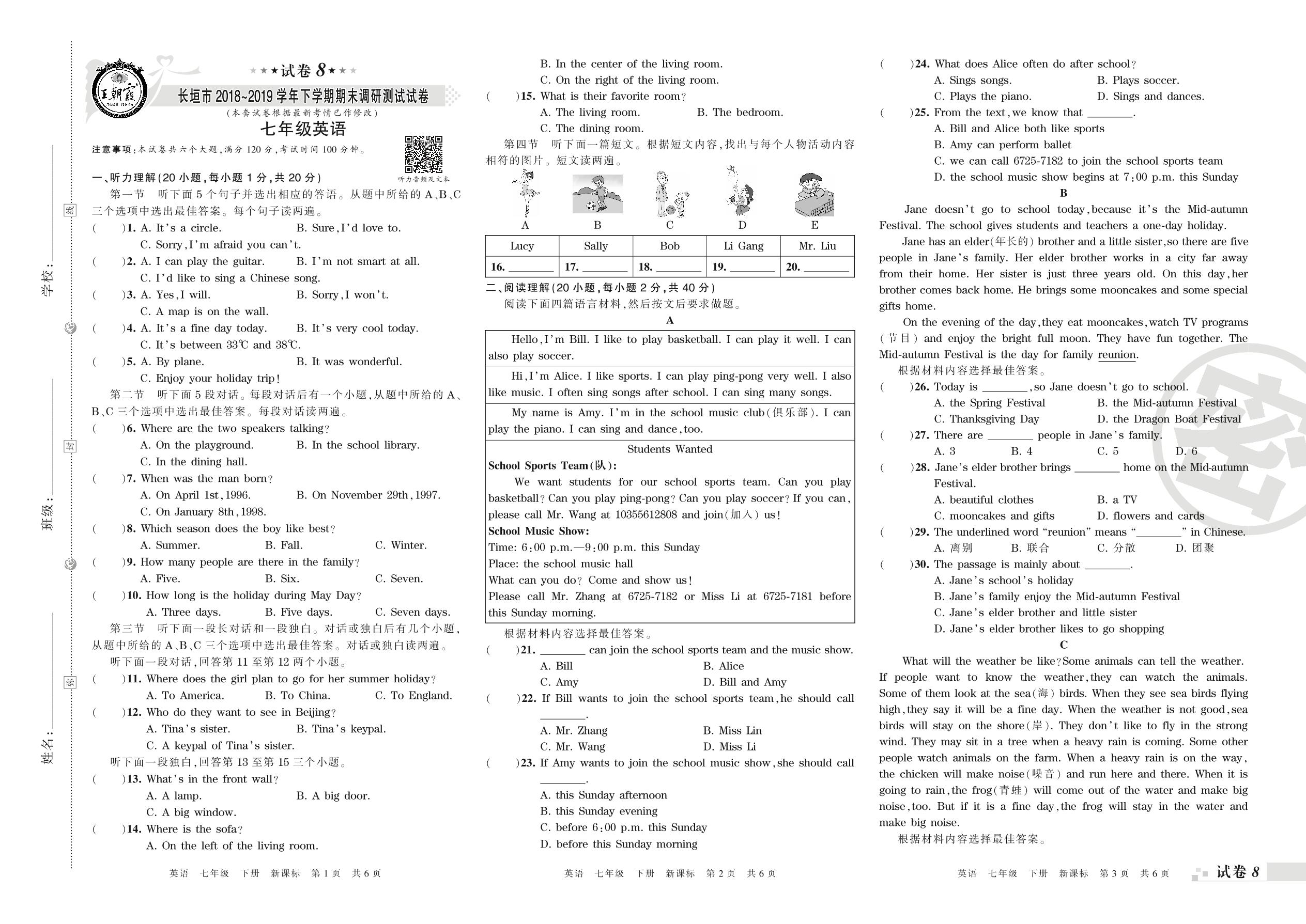 2018-2019学年第二学期长垣市七年级英语试卷(新课版)【8】