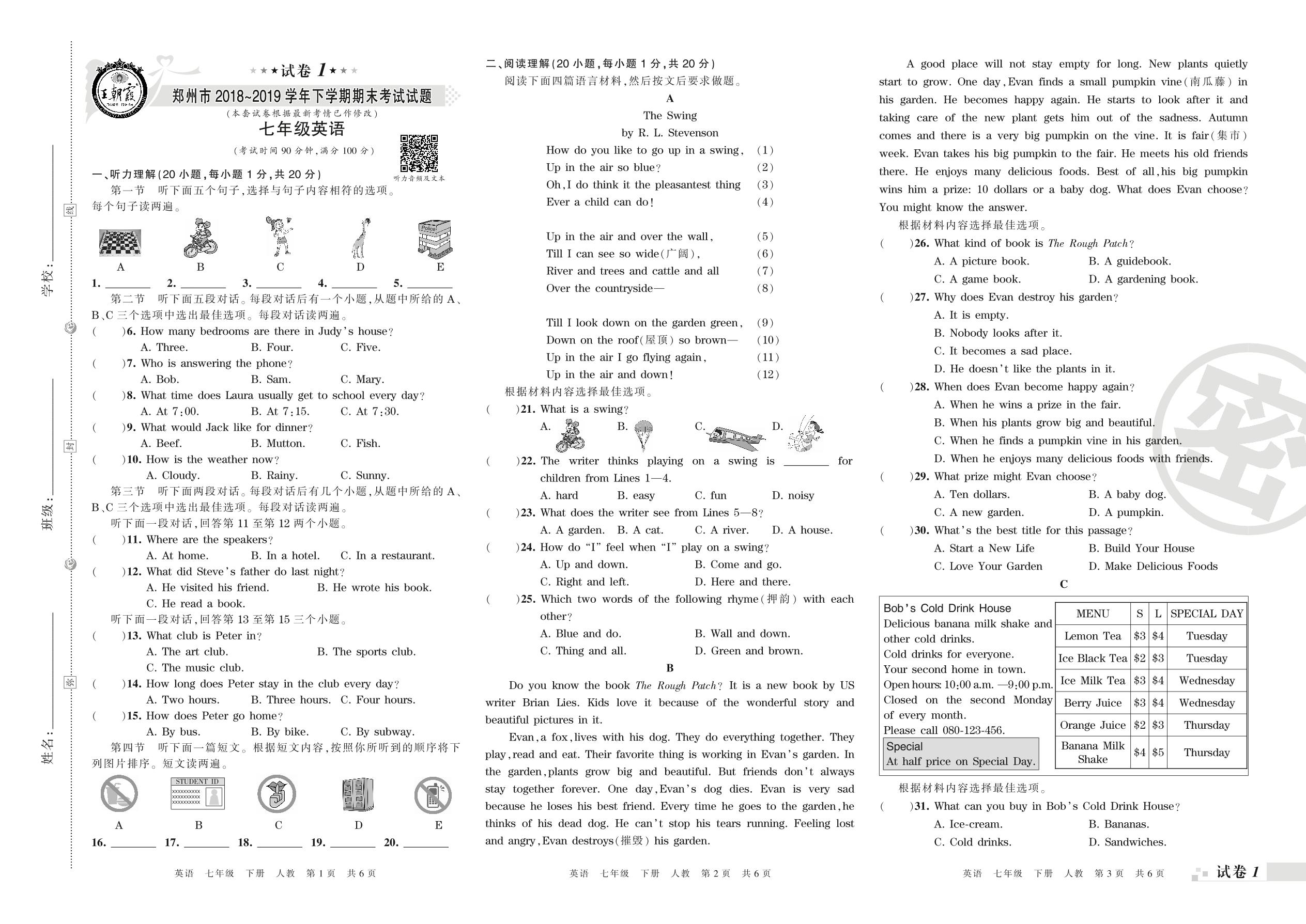 2018-2019学年第二学期郑州市七年级英语试卷(人教版)_R210807194320【1】