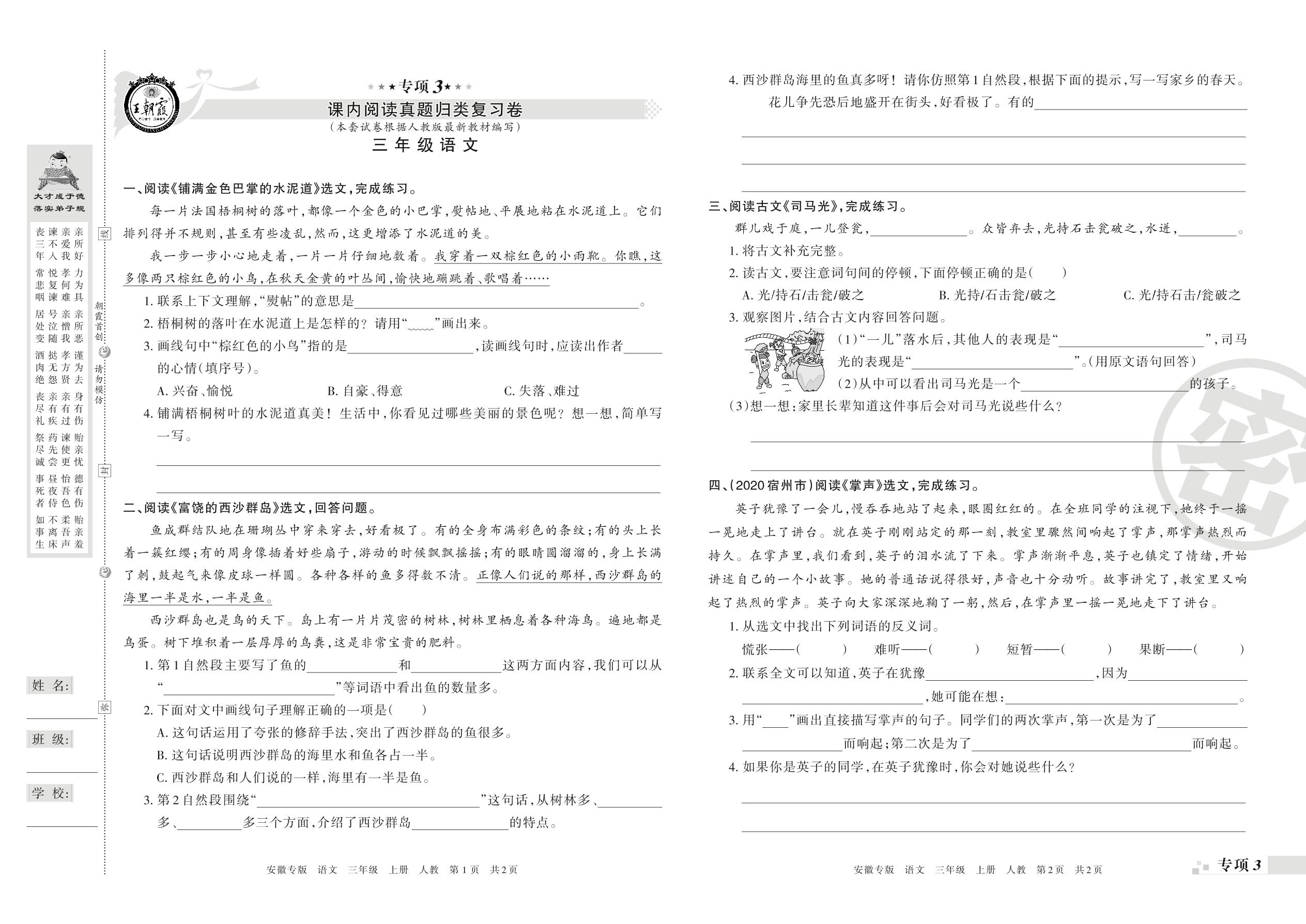 王朝霞期末专项卷——课内阅读、课外阅读真题归类复习三年级上册语文(人教版)_R21080185340【0】