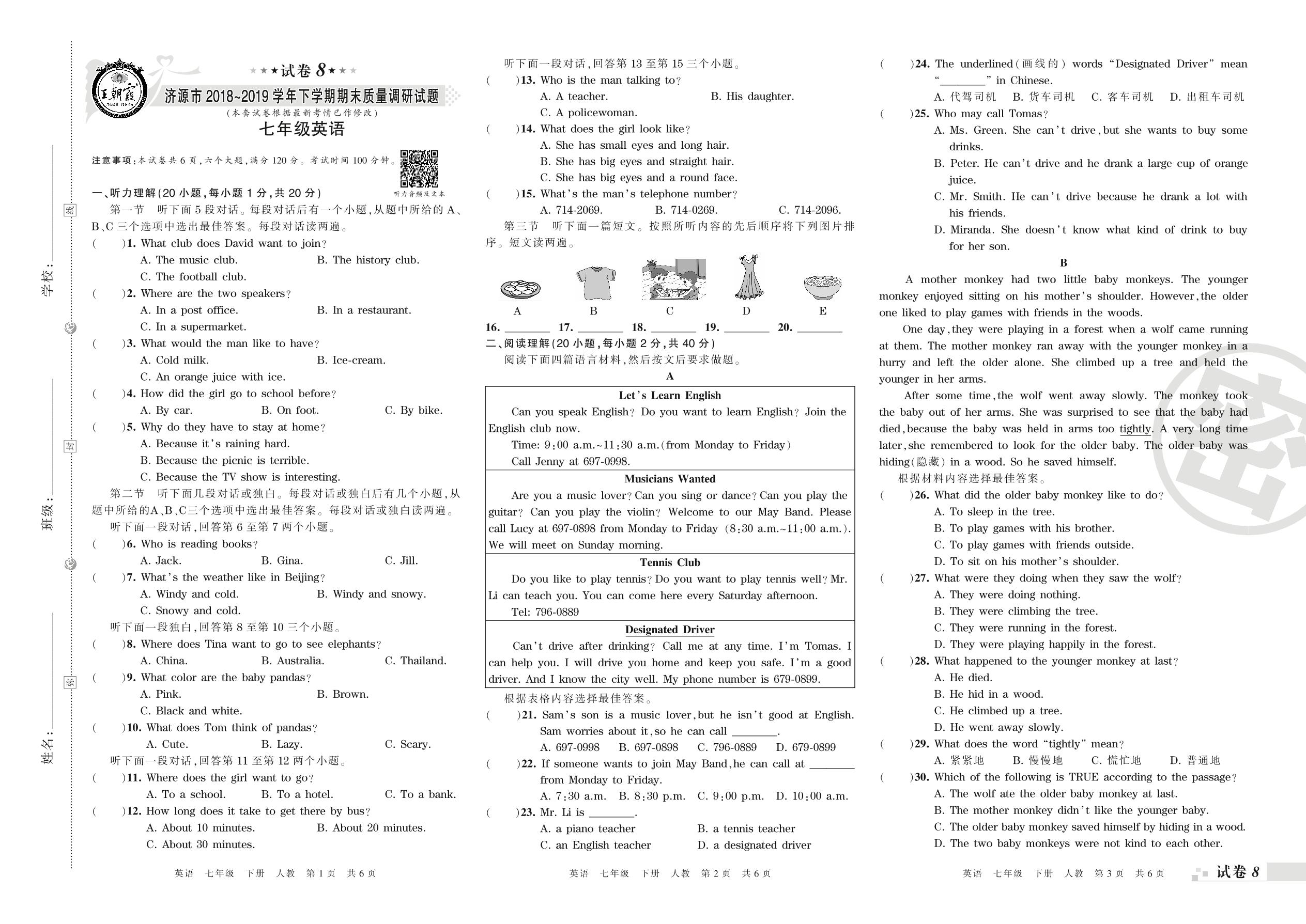2018-2019学年第二学期济源市七年级英语试卷(人教版)【8】