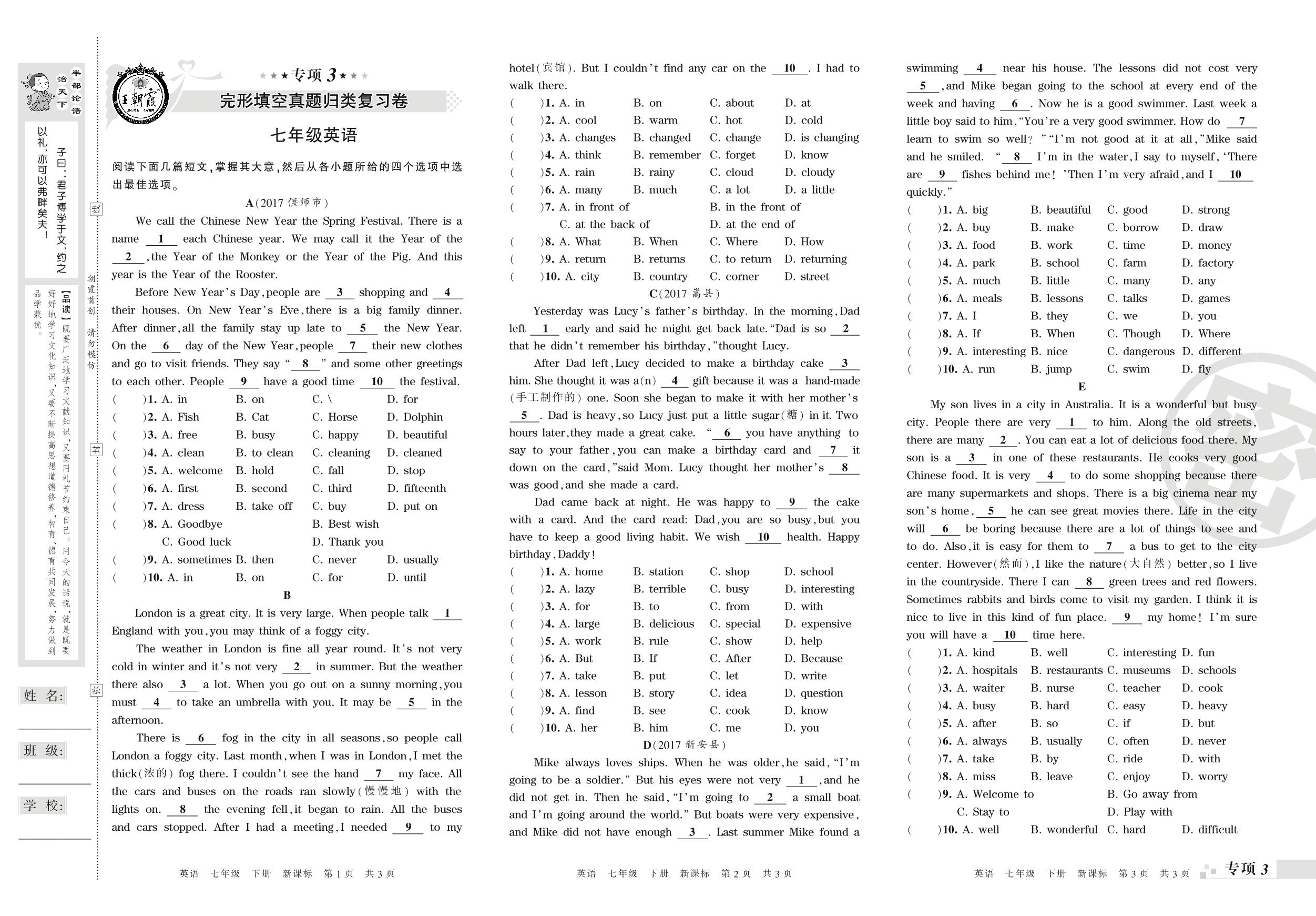 王朝霞期末专项卷——完形填空、选择型阅读真题归类复习卷七年级下册英语(新课版)_R210807194457【0】
