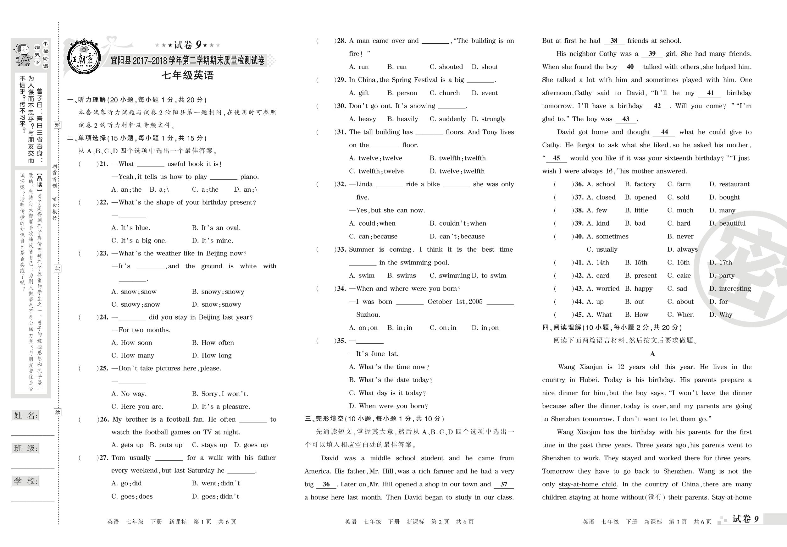 2017-2018学年第二学期洛阳市宜阳县七年级英语试卷(新课版)【9】