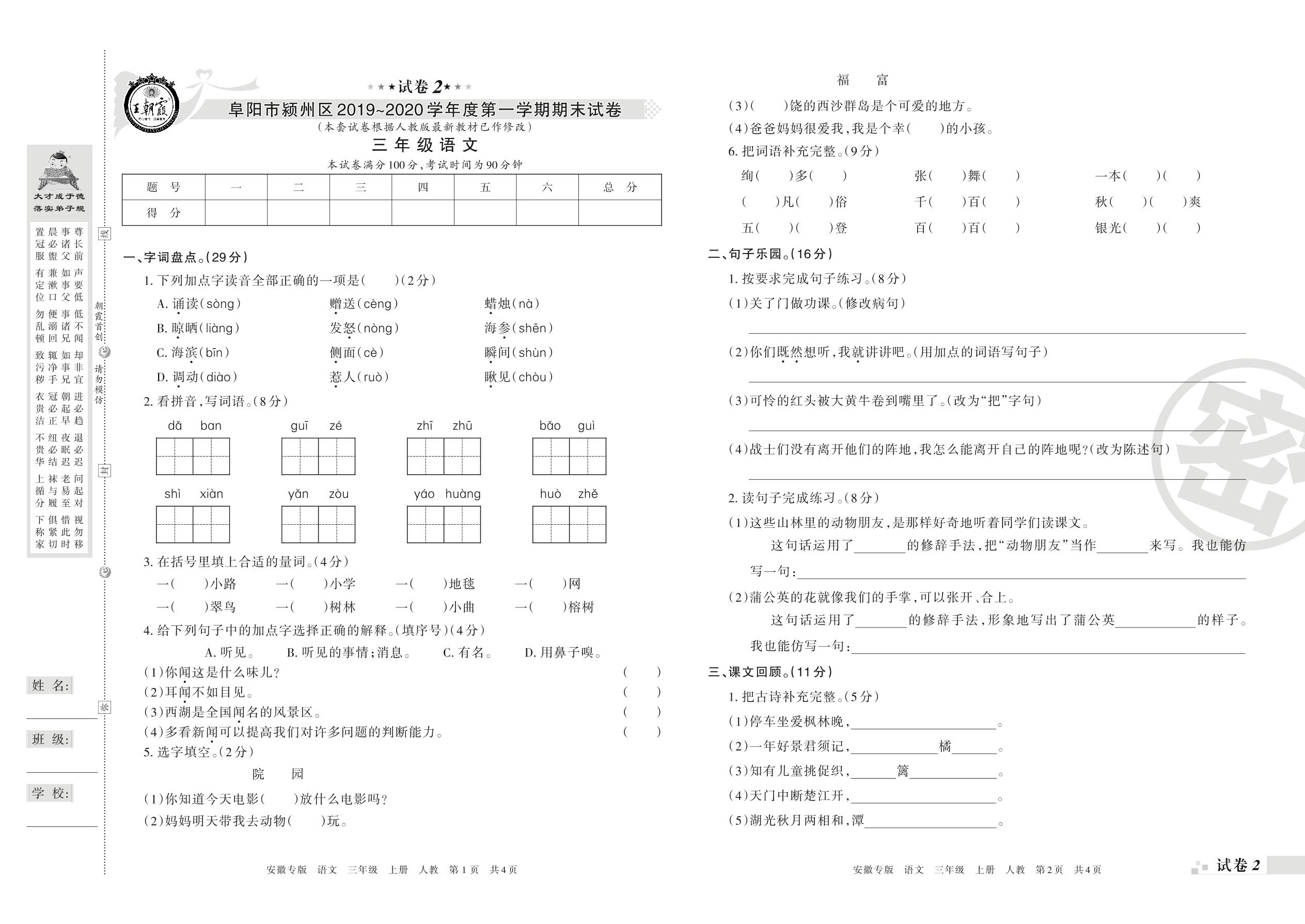 2019-2020学年第一学期阜阳市颍州市三年级语文试卷(人教版)【2】