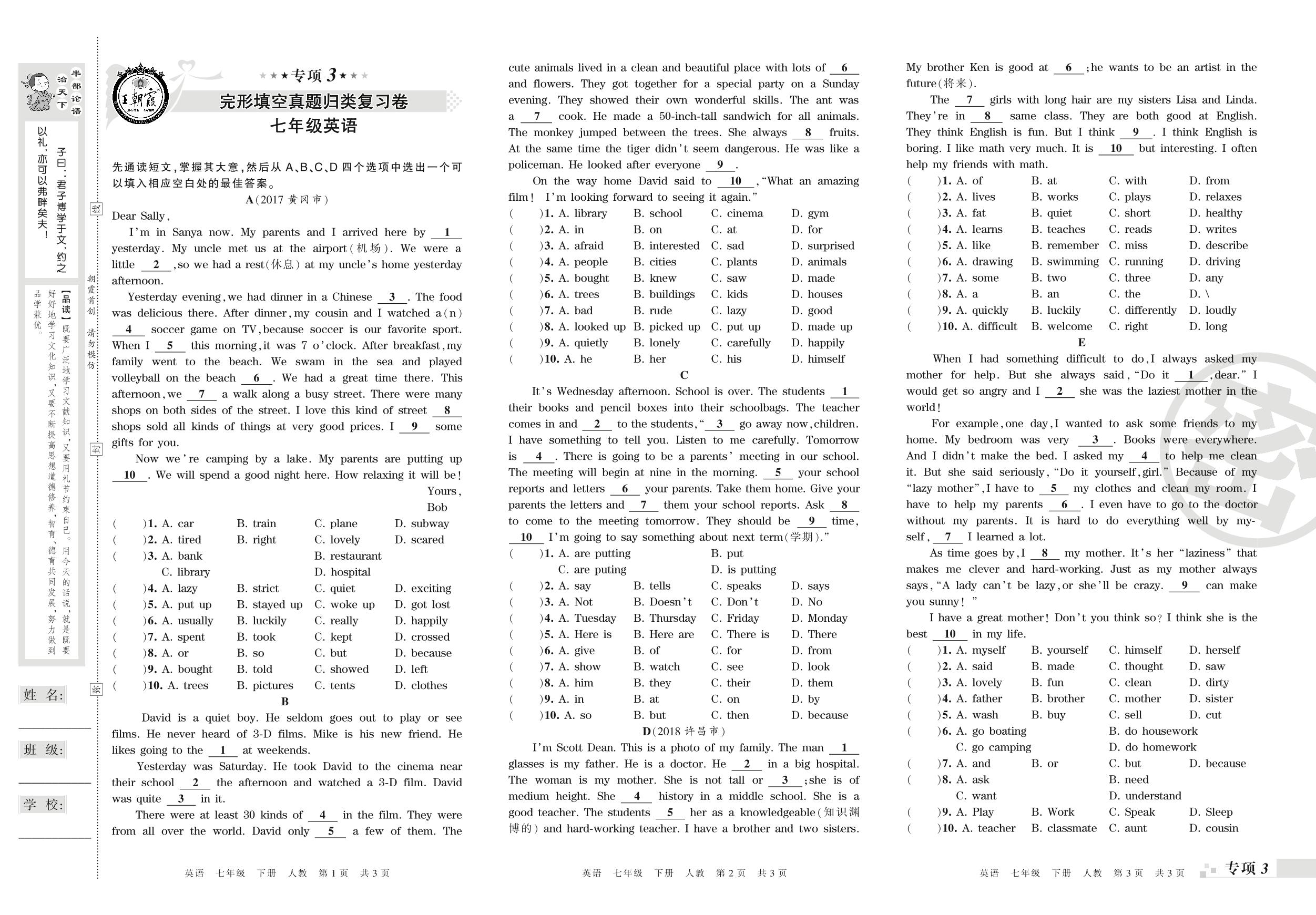 王朝霞期末专项卷——完形填空、选择型阅读真题归类复习卷七年级下册英语(人教版)_R210807194647【0】