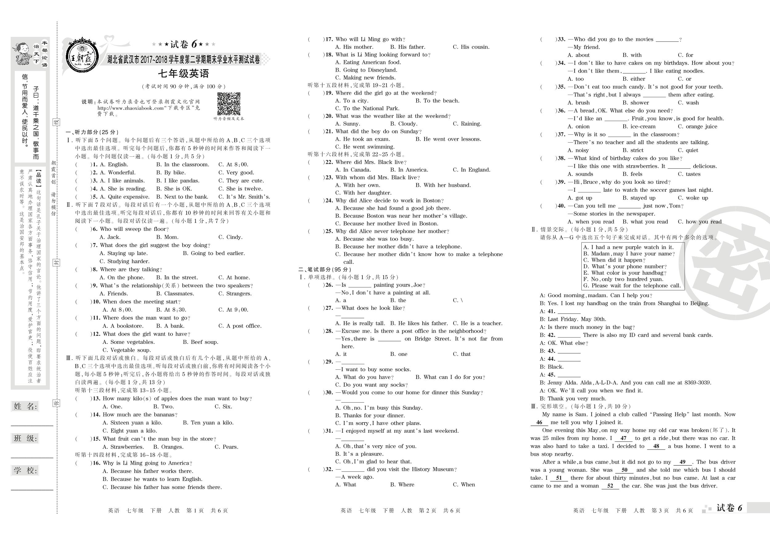2017-2018学年第二学期湖北省武汉市七年级英语试卷(人教版)【6】