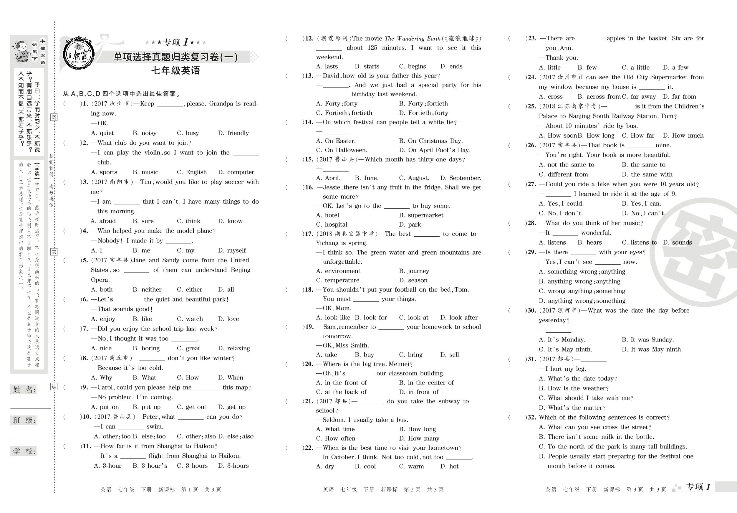 王朝霞期末专项卷——单项选择(一)(二)真题归类复习卷七年级下册英语(新课版)_R210807194852【0】