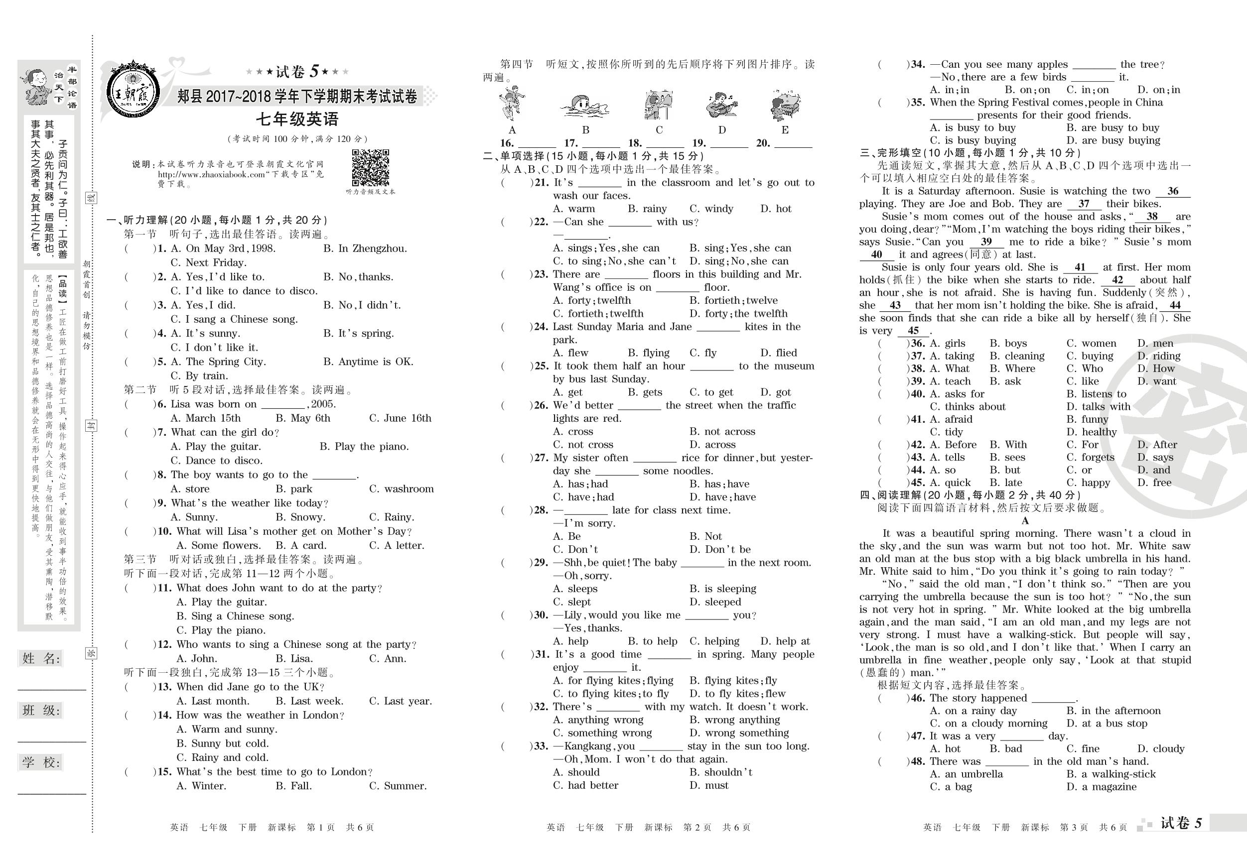 2017-2018学年第二学期平顶山市郏县七年级英语试卷(新课版)【5】