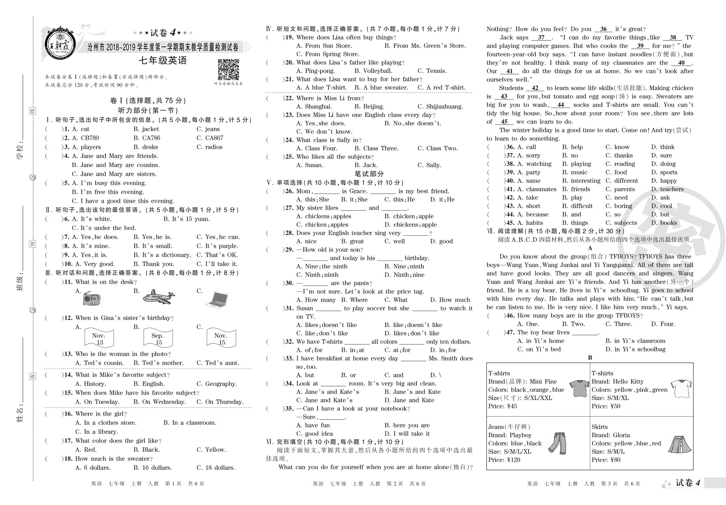2018-2019学年第一学期沧州市七年级英语试卷(人教版)【4】
