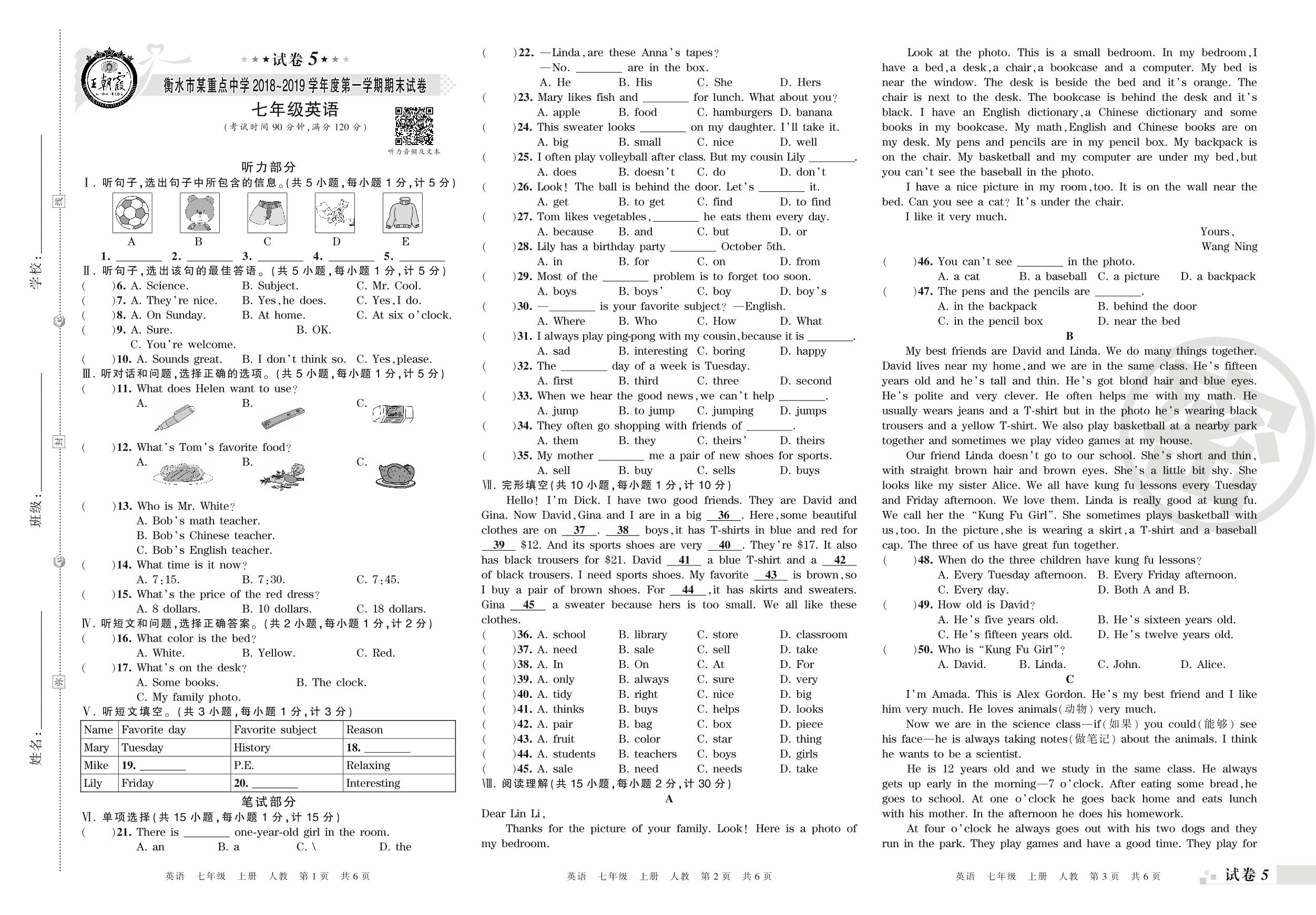 2018-2019学年第一学期衡水市某重点中学七年级英语试卷(人教版)【5】