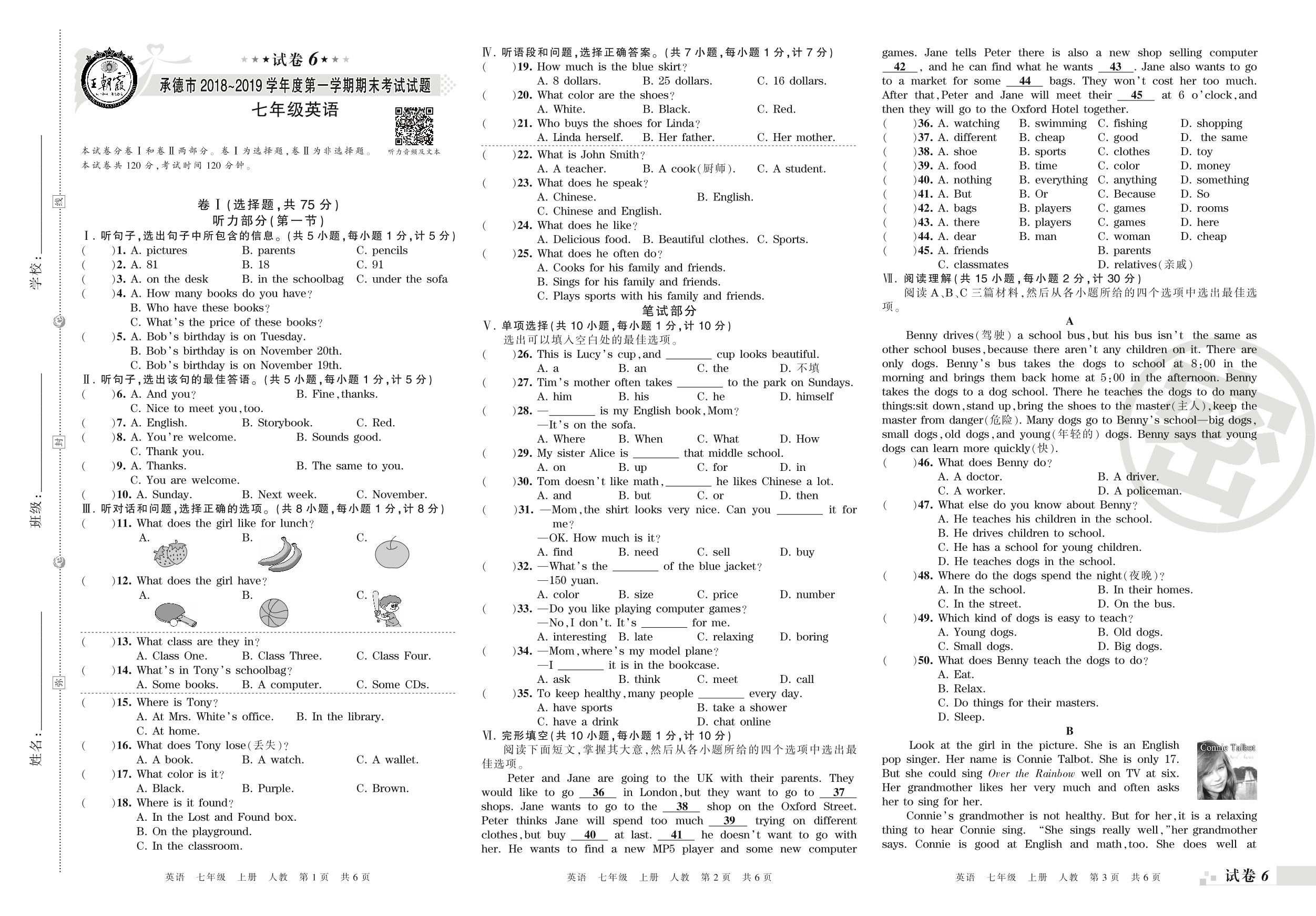 2018-2019学年第一学期承德市七年级英语试卷(人教版)【6】