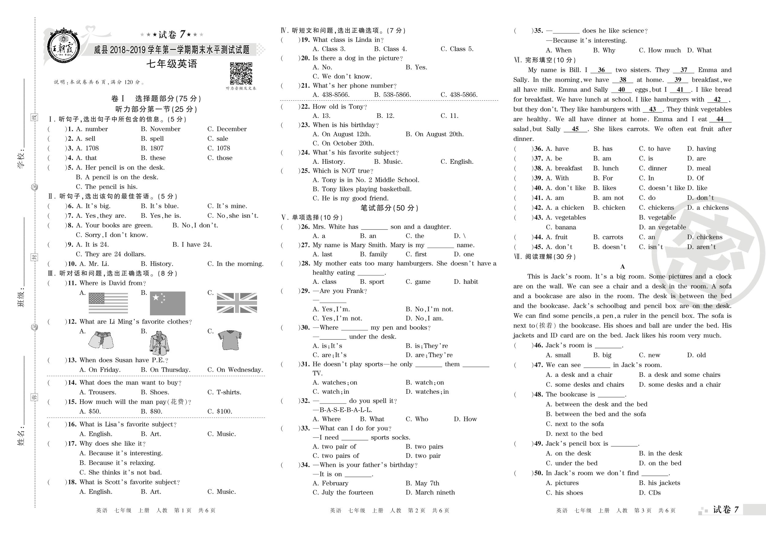 2018-2019学年第一学期邢台市威县七年级英语试卷(人教版)【7】