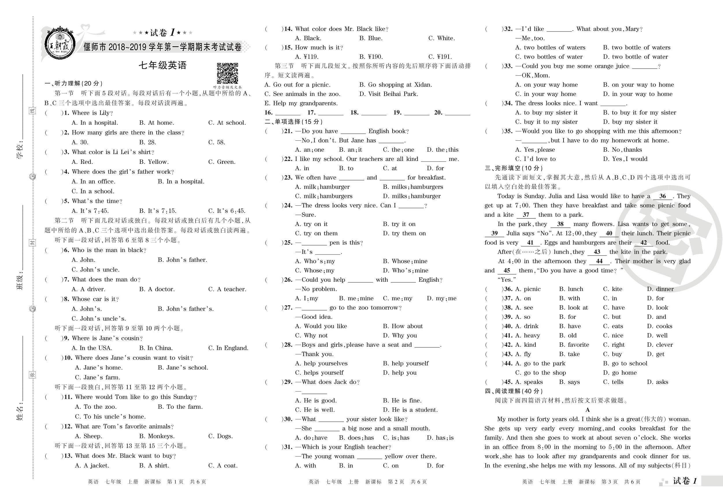 2018-2019学年第一学期偃师市七年级英语试卷(新课版)【1】