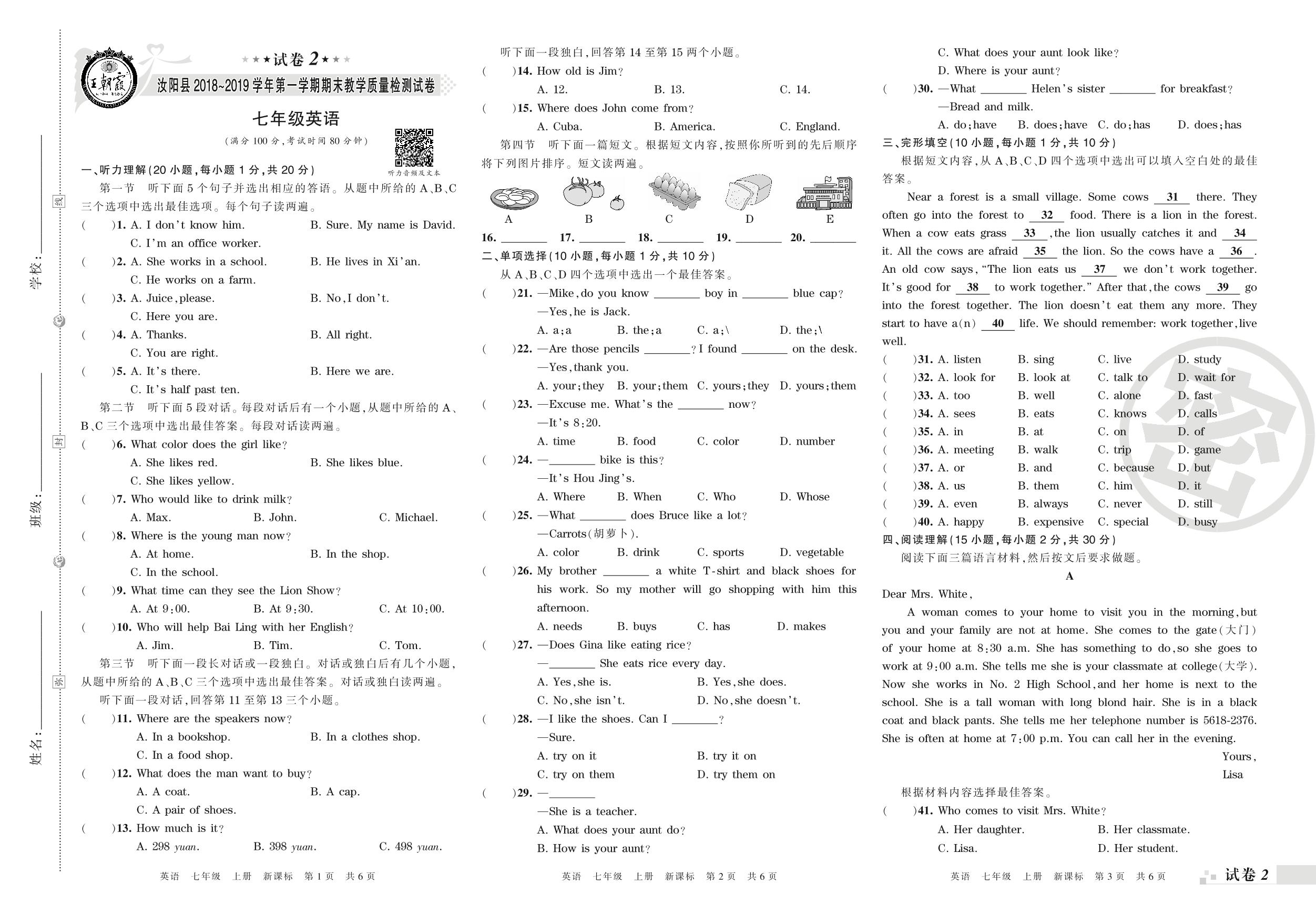 2018-2019学年第一学期洛阳市汝阳县七年级英语试卷(新课版)【2】