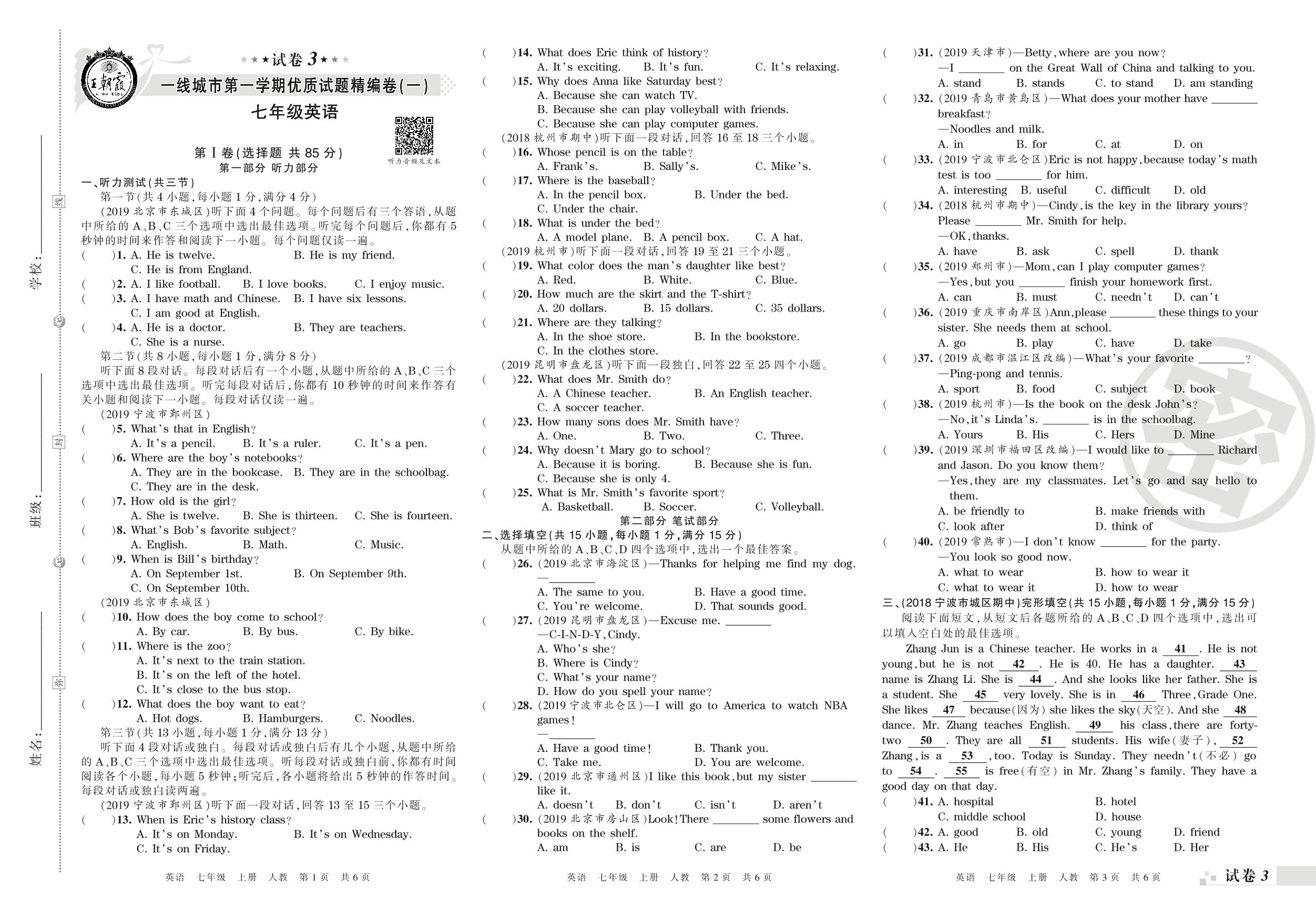 一线城市优质试题精编卷(一)七年级上册英语(人教版)【3】
