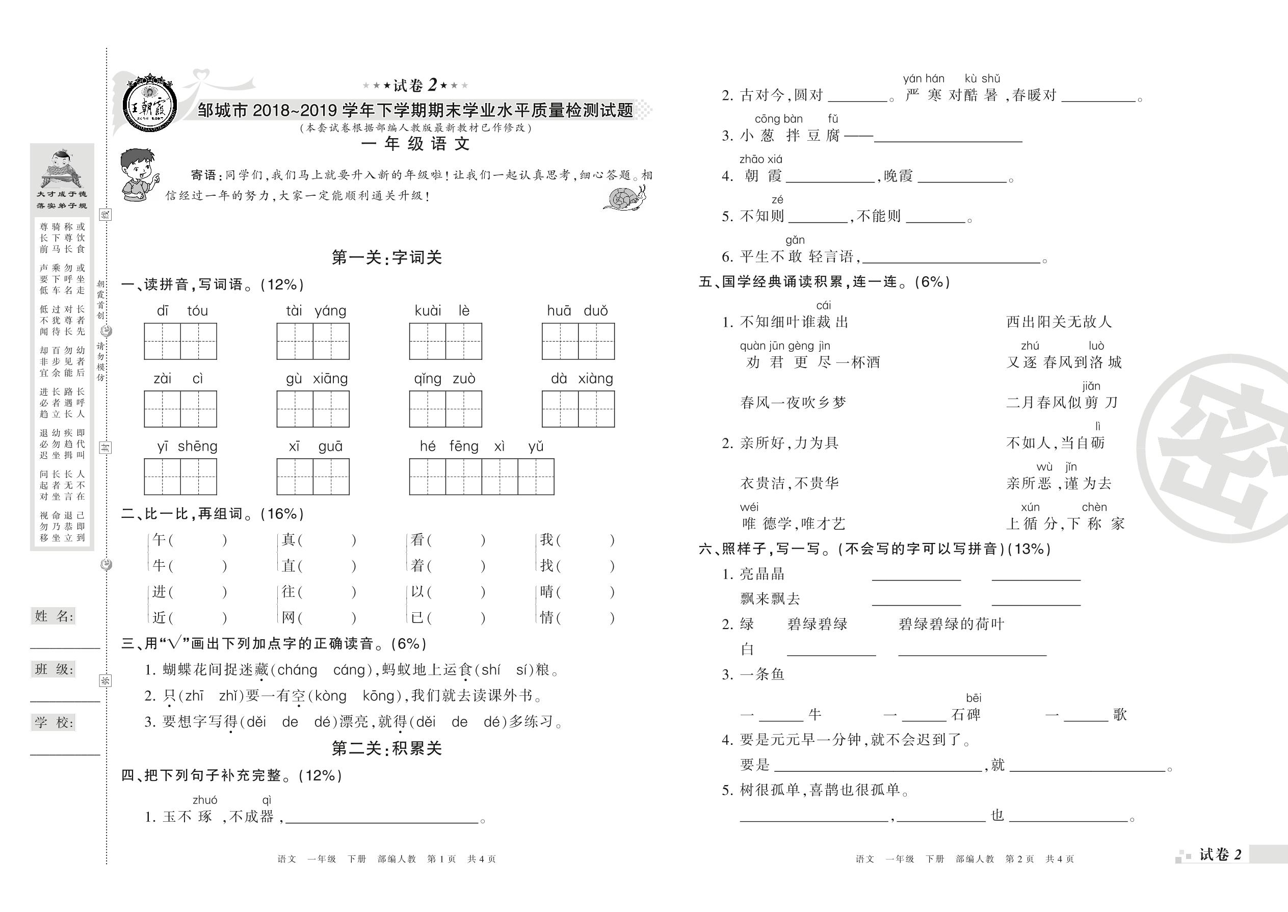 2018-2019学年第二学期邹城市一年级语文试卷(人教版)【2】