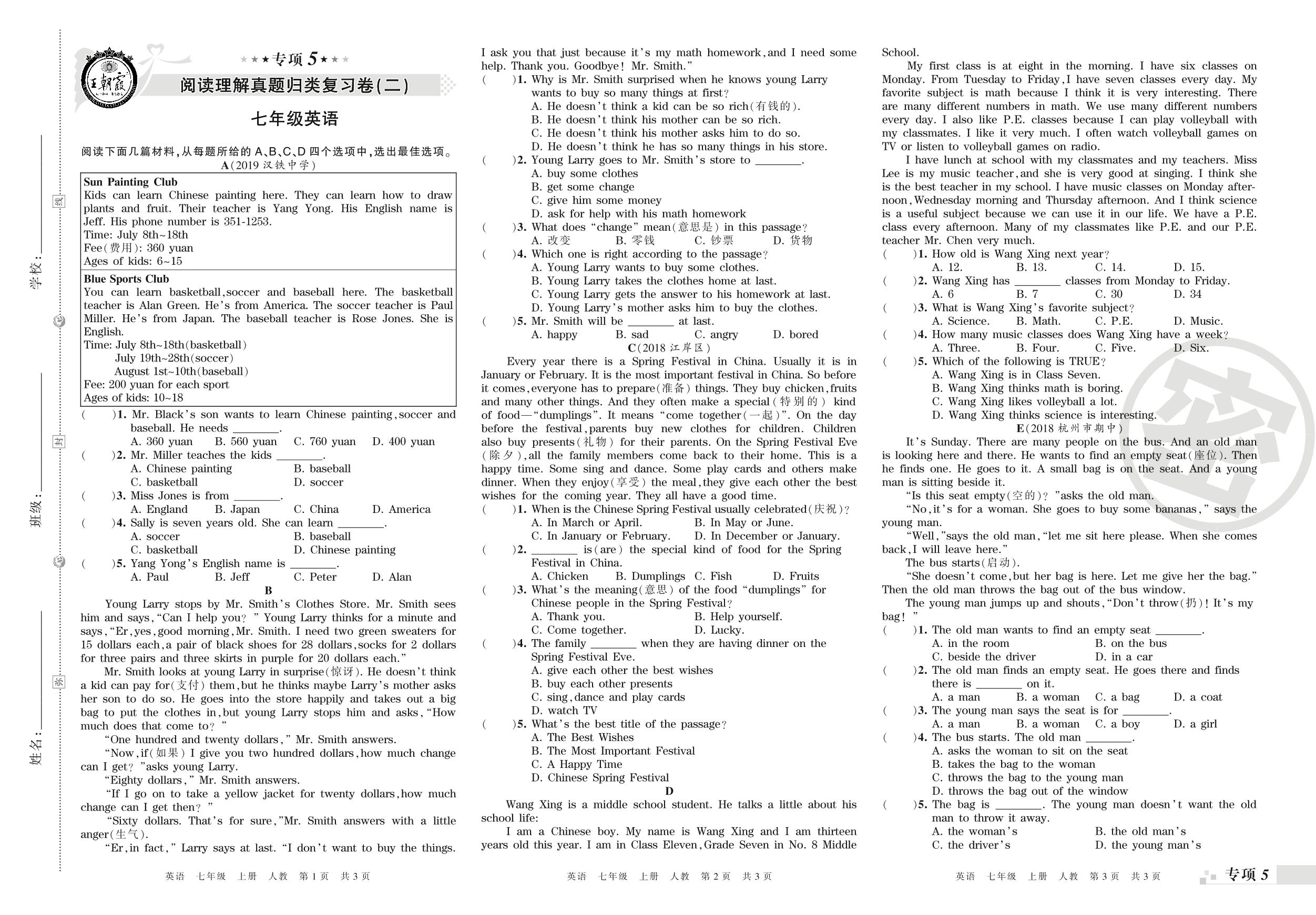 王朝霞期末专项卷——阅读理解、词与短语填空真题归类复习七年级上册英语(人教版)_R210807195350【0】