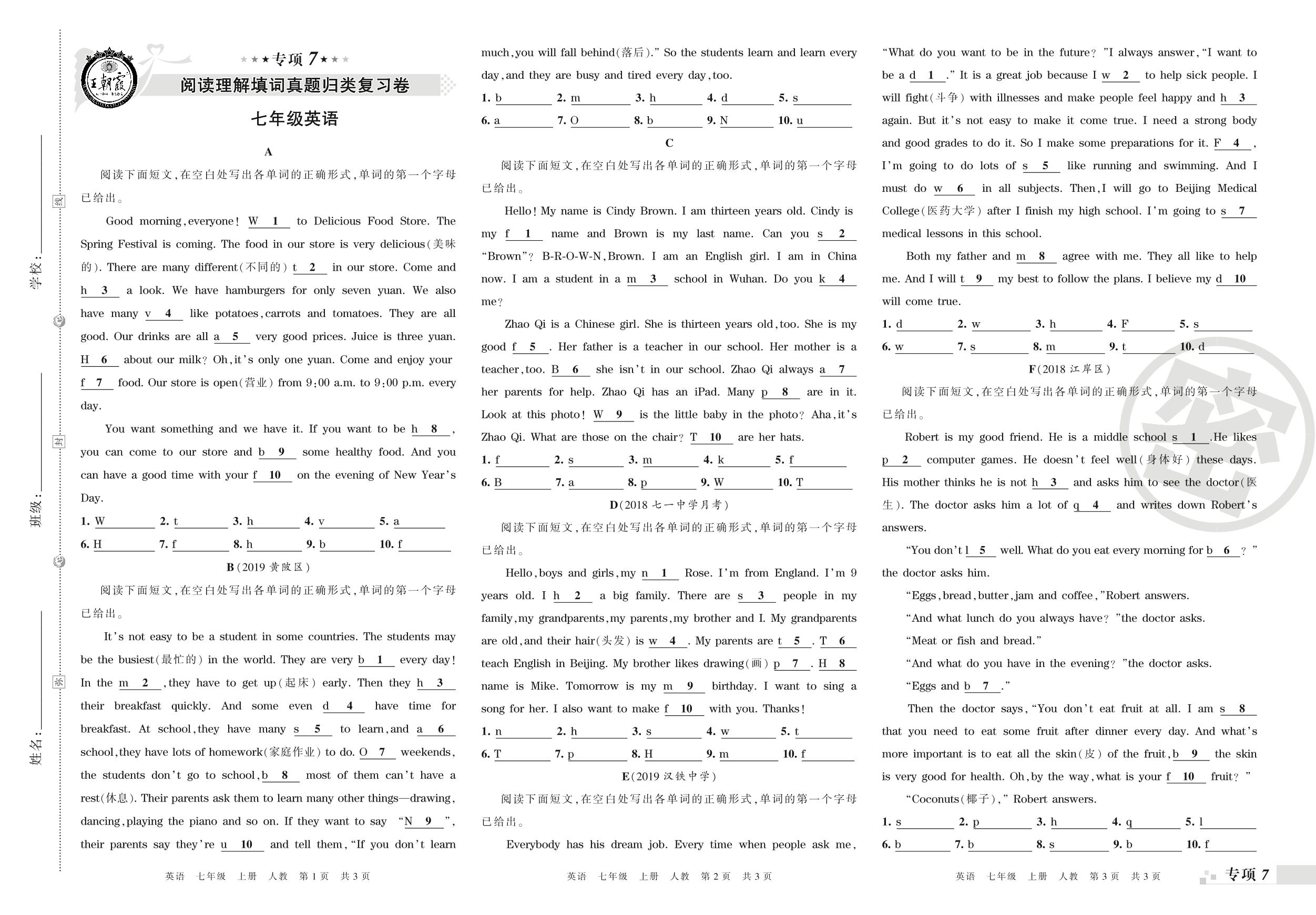 王朝霞期末专项卷——阅读理解填词、书面表达真题归类复习七年级上册英语(人教版)_R210807195357【0】
