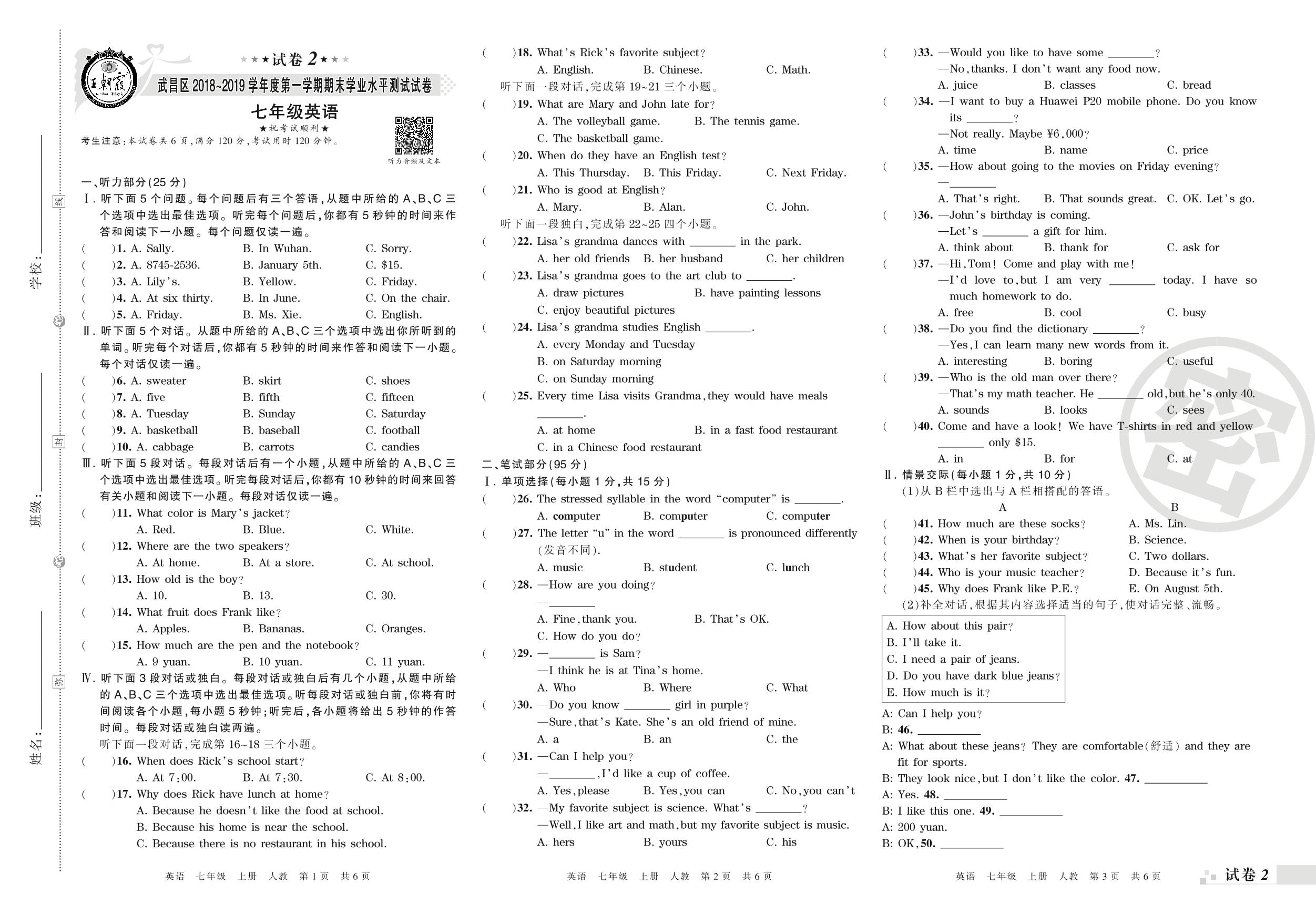 2018-2019学年第一学期武汉市武昌区七年级英语试卷(人教版)【2】
