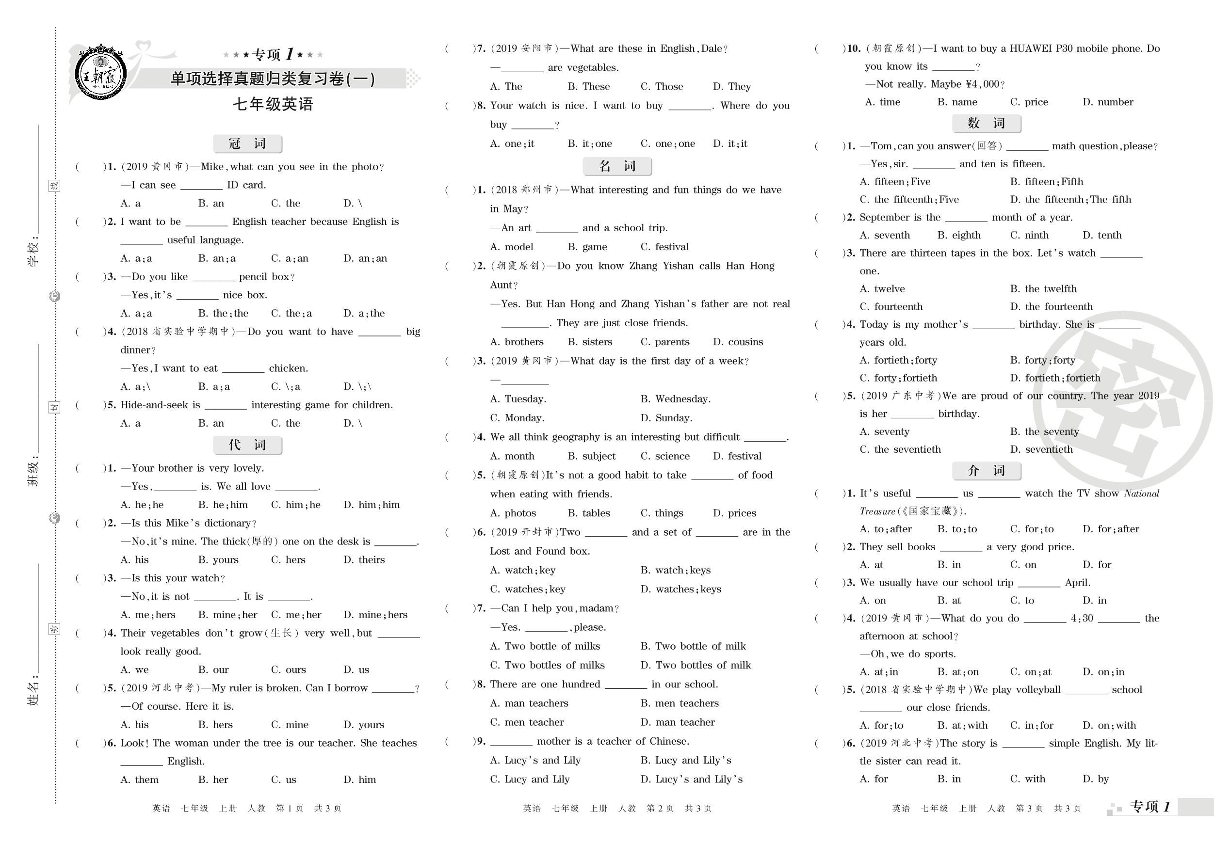 王朝霞期末专项卷——单项选择真题归类复习七年级上册英语(人教版)_R210807195416【0】