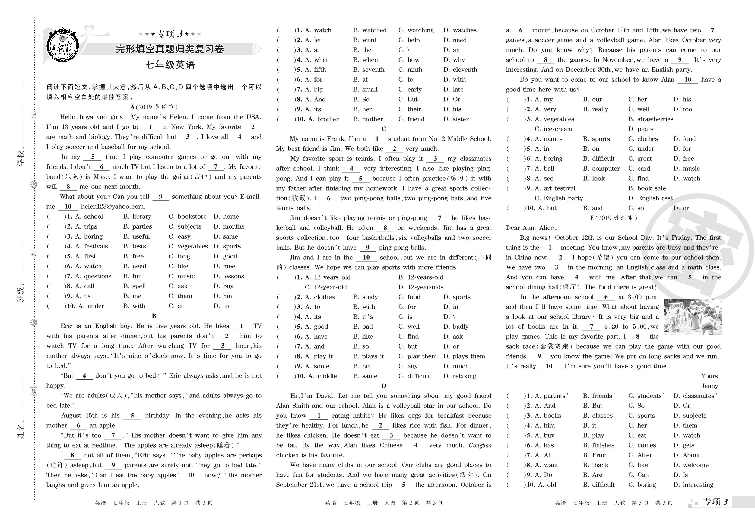 王朝霞期末专项卷——完形填空、选择型阅读真题归类复习七年级上册英语(人教版)_R210807195422【0】