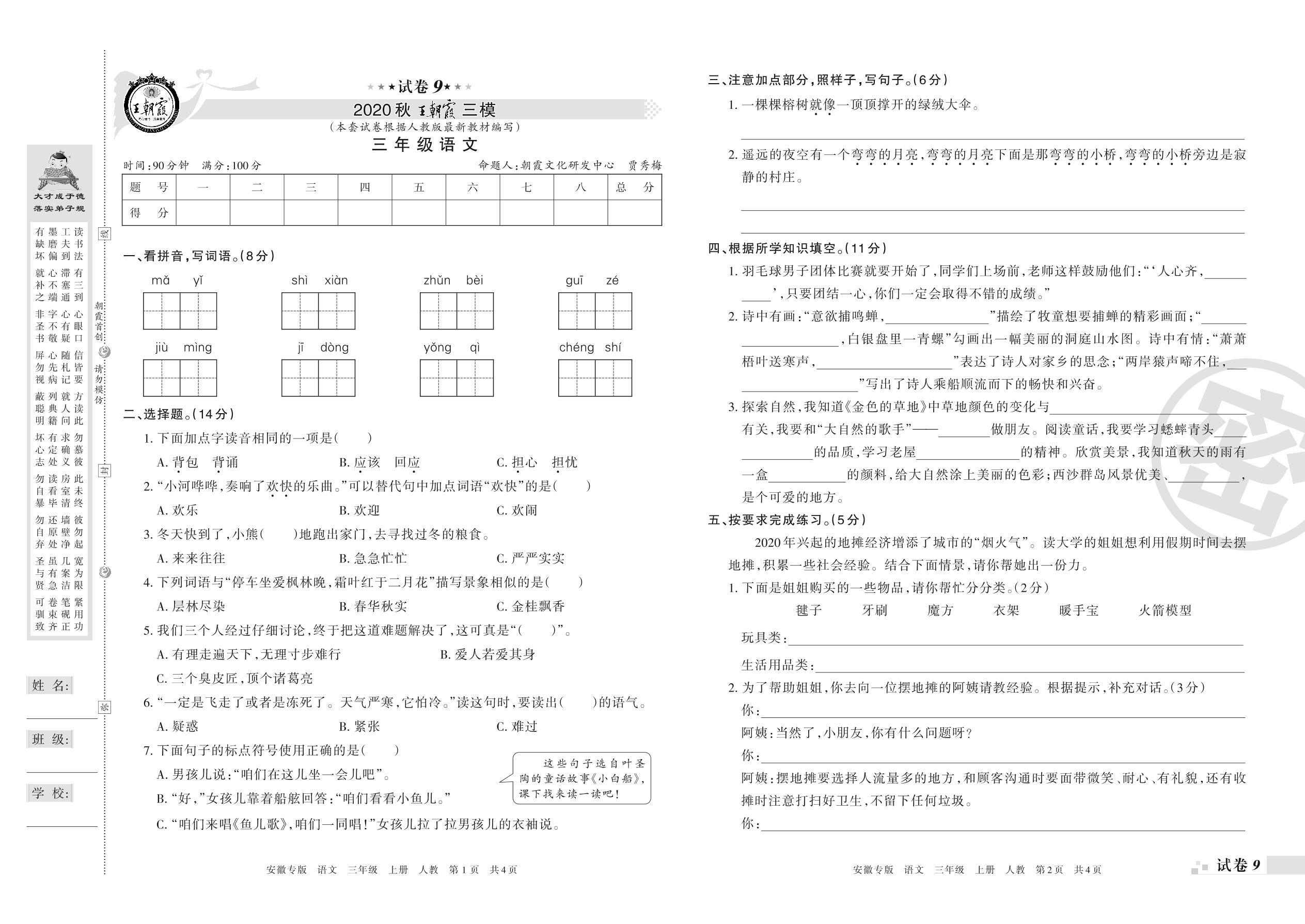 王朝霞期末模拟卷三年级上册语文(人教版)_R21080185421【9】