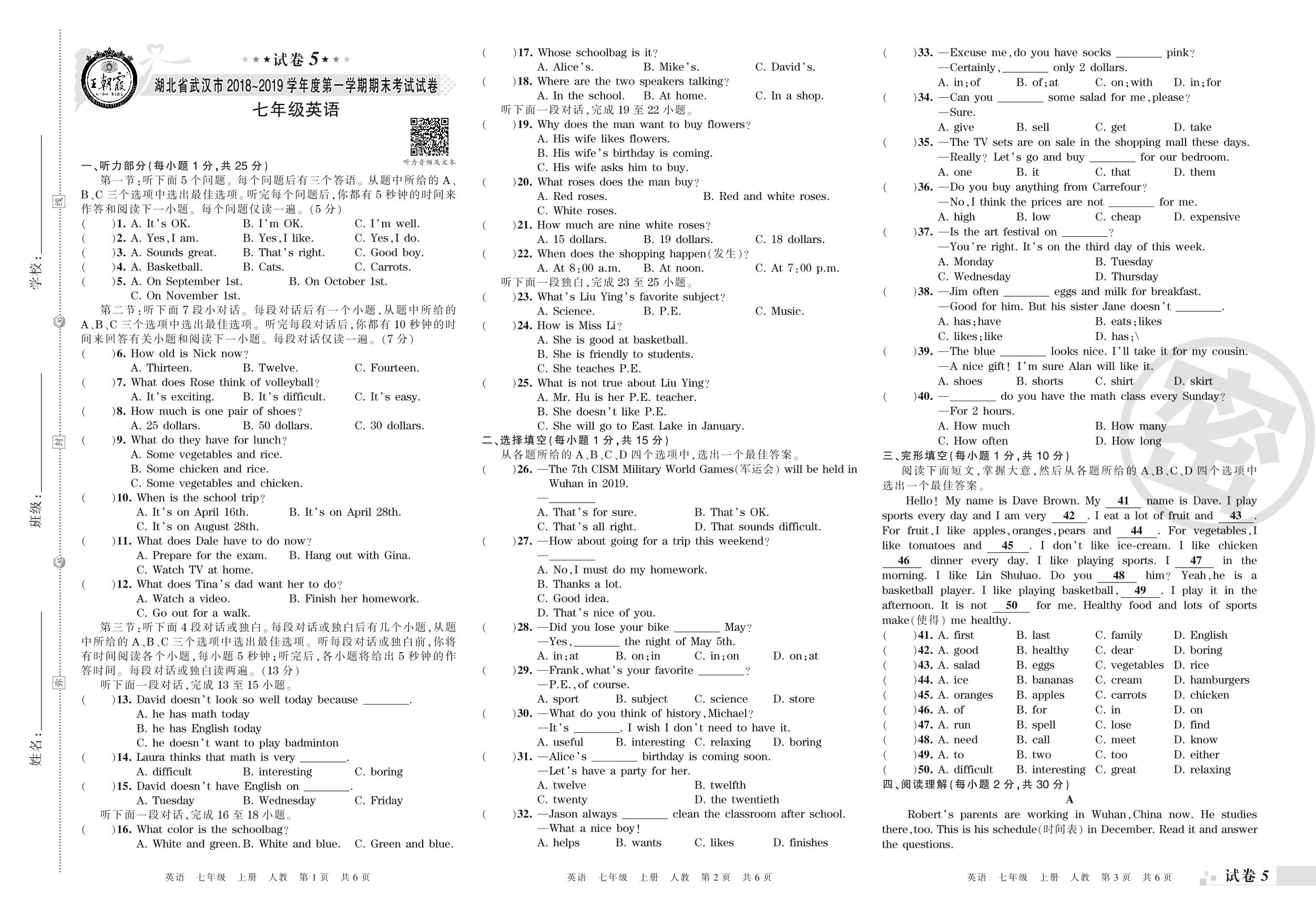 2018-2019学年第一学期湖北省武汉市七年级英语试卷(人教版)【5】