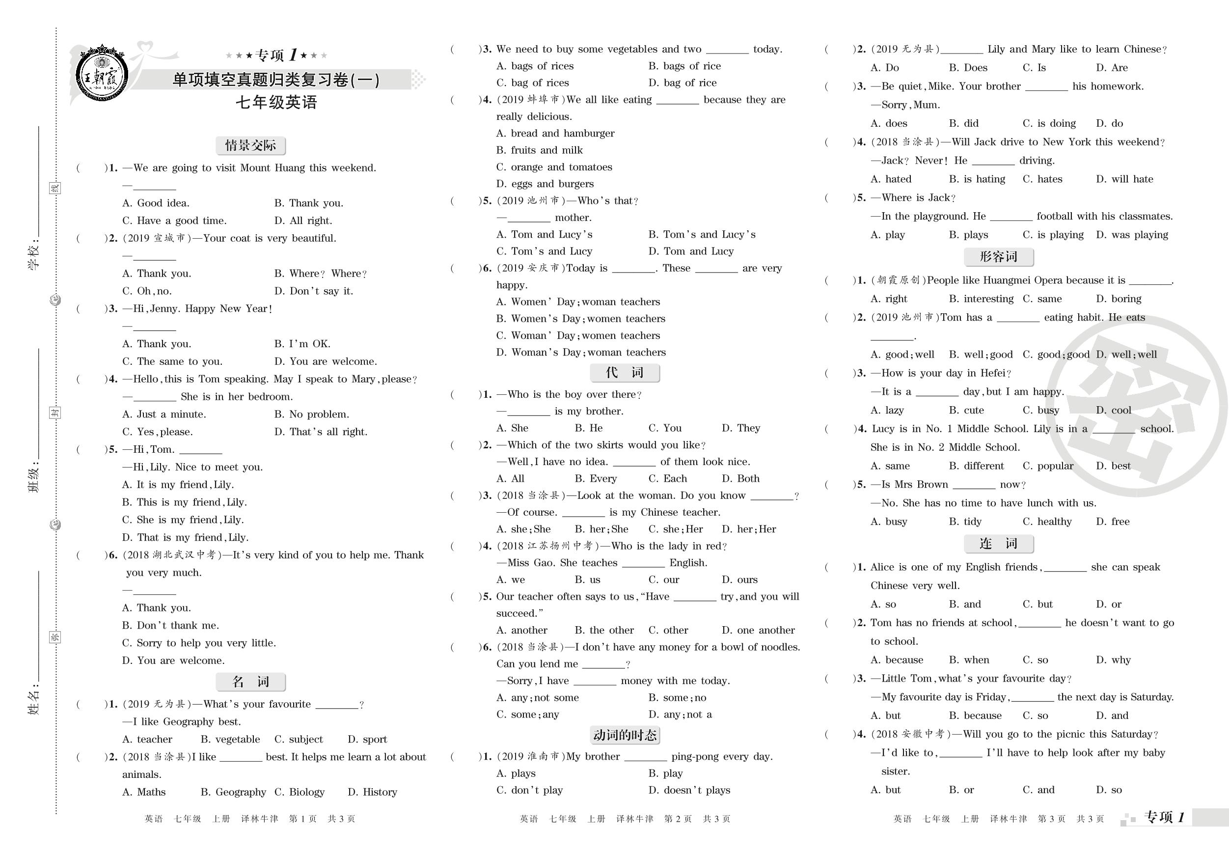 王朝霞期末专项卷——单项填空真题归类复习七年级上册英语(译林版)_R210807195537【0】