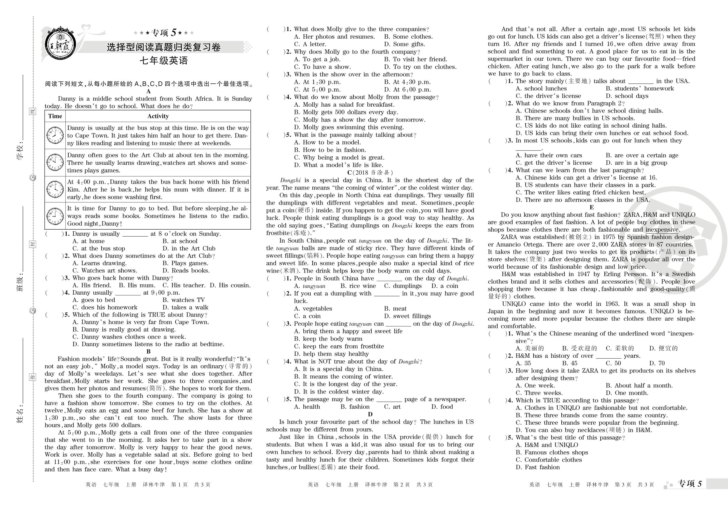 王朝霞期末专项卷——选择型阅读、任务型阅读真题归类复习七年级上册英语(译林版)_R210807195547【0】