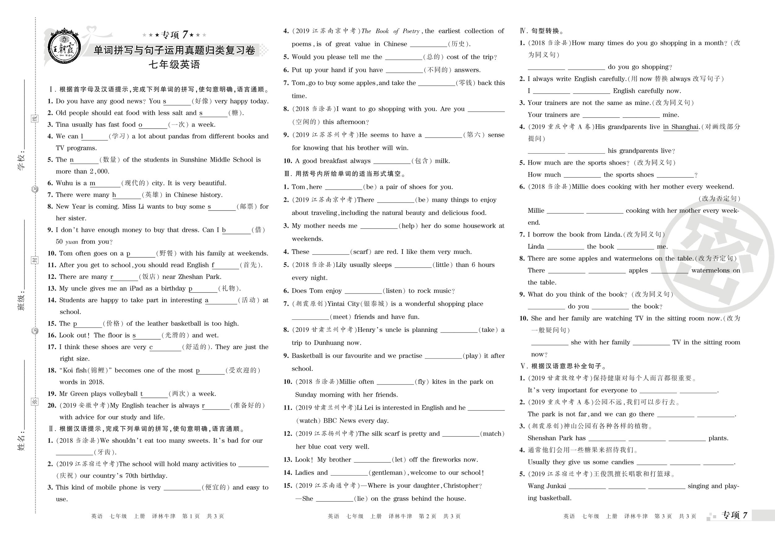 王朝霞期末专项卷——单词拼写与句子运用、书面表达真题归类复习七年级上册英语(译林版)_R210807195553【0】