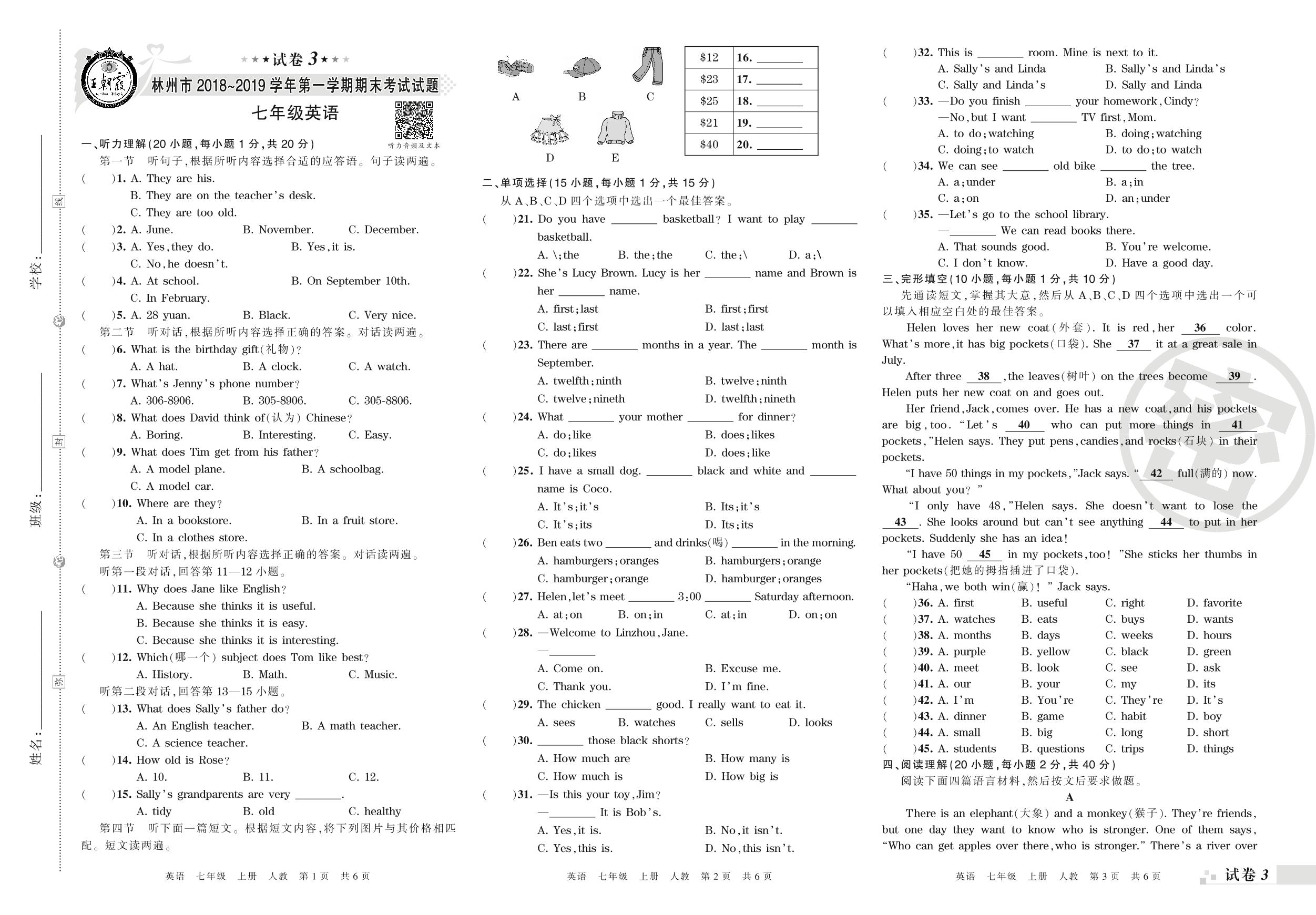 2018-2019学年第一学期林州市七年级英语试卷(人教版)【3】