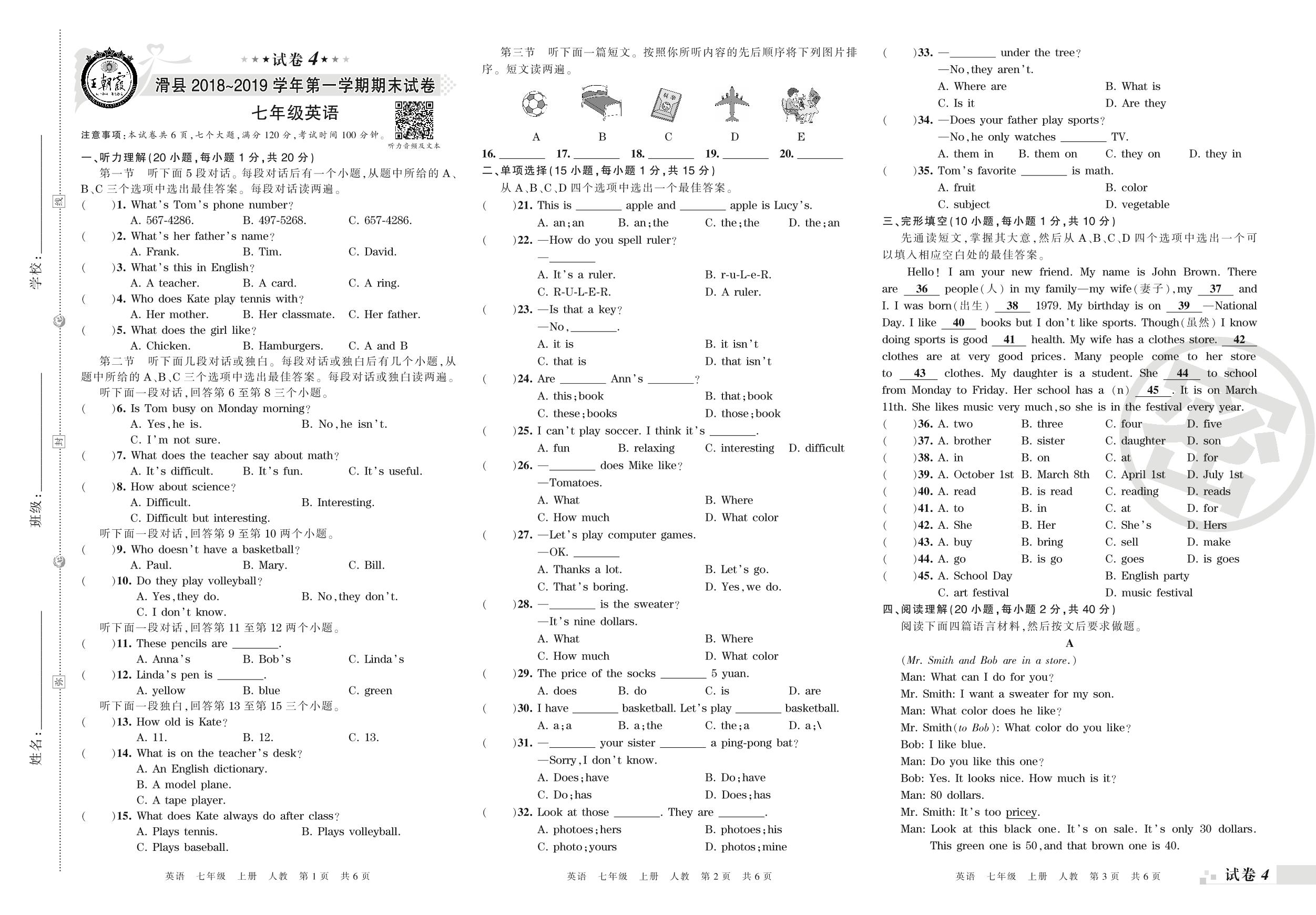 2018-2019学年第一学期安阳市滑县七年级英语试卷(人教版)【4】